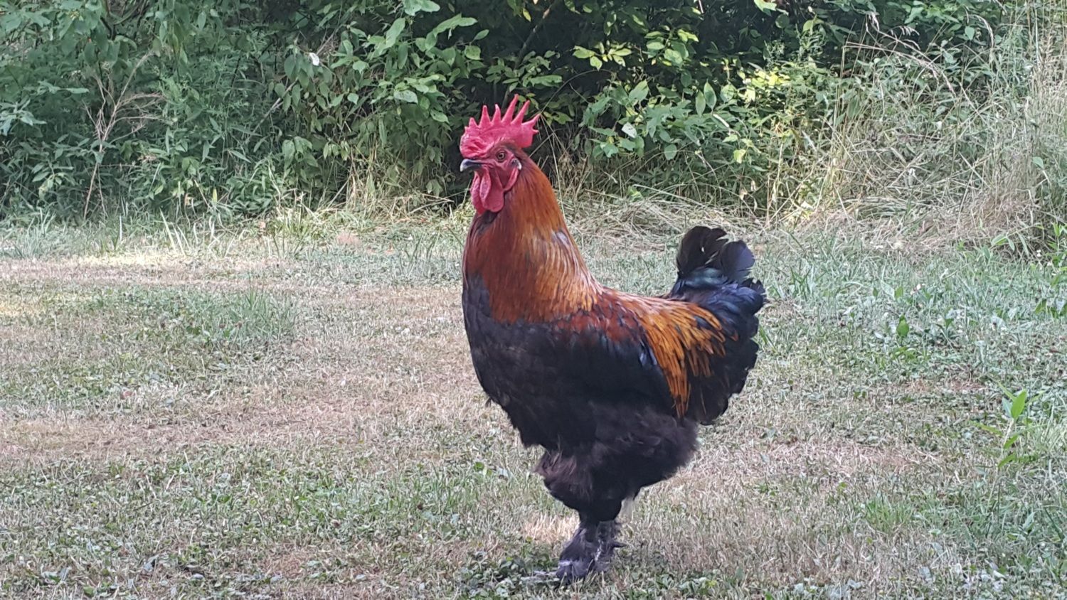 I have another I should get photos of. He is bigger through the chest, has a more evenly serrated comb, and a more copper colour on his hackles and sickle feathers with lighter feathering.