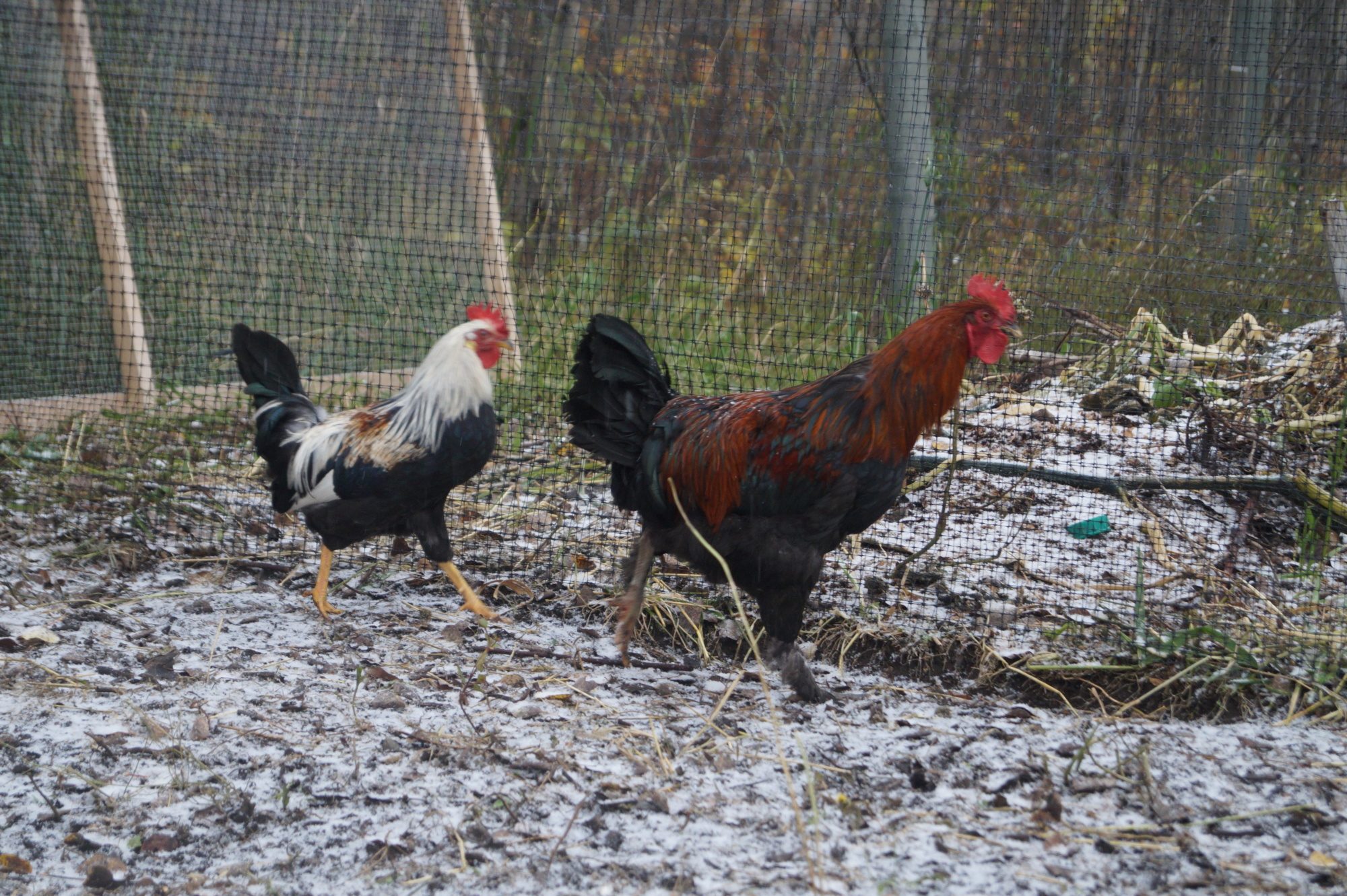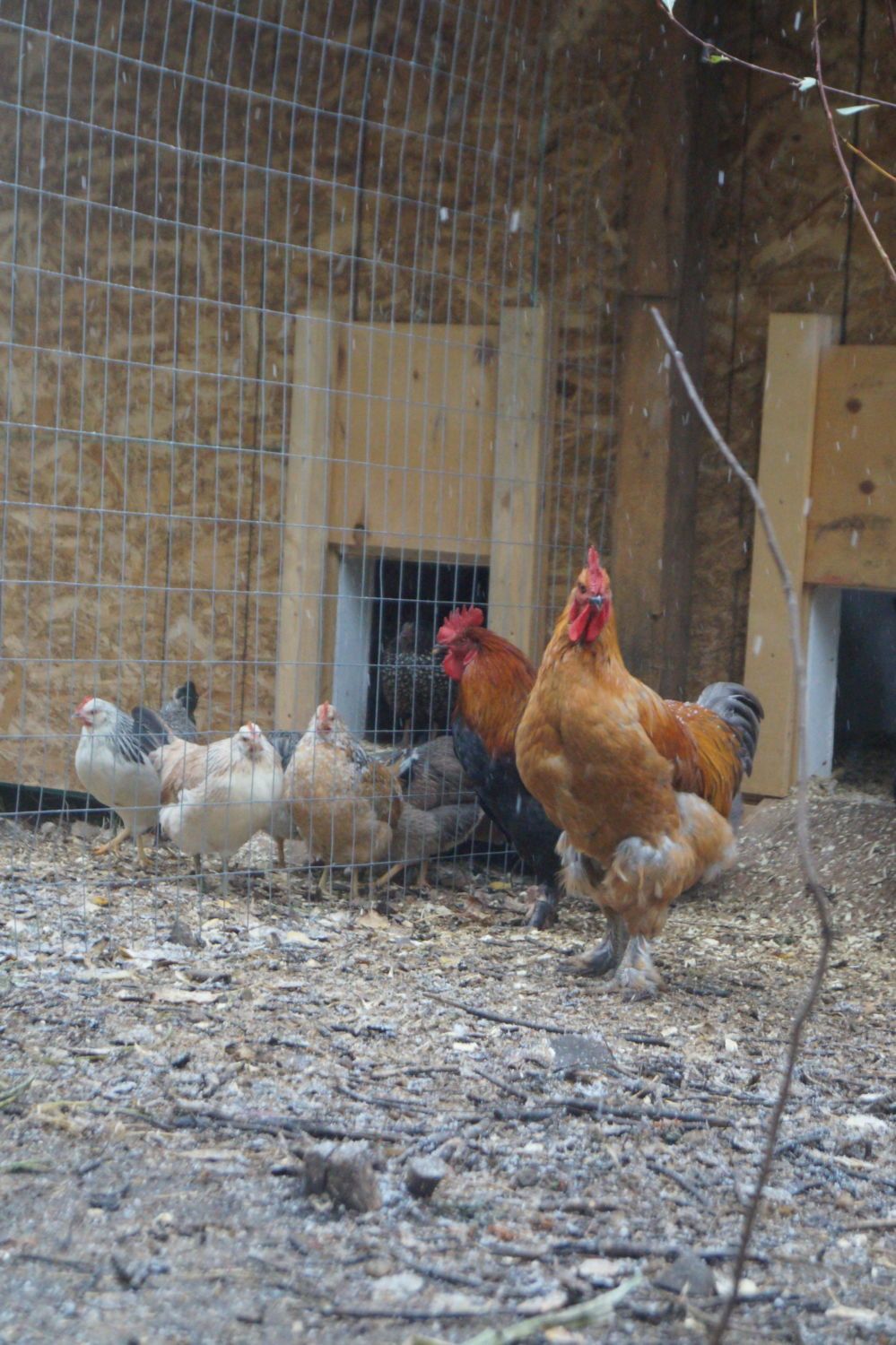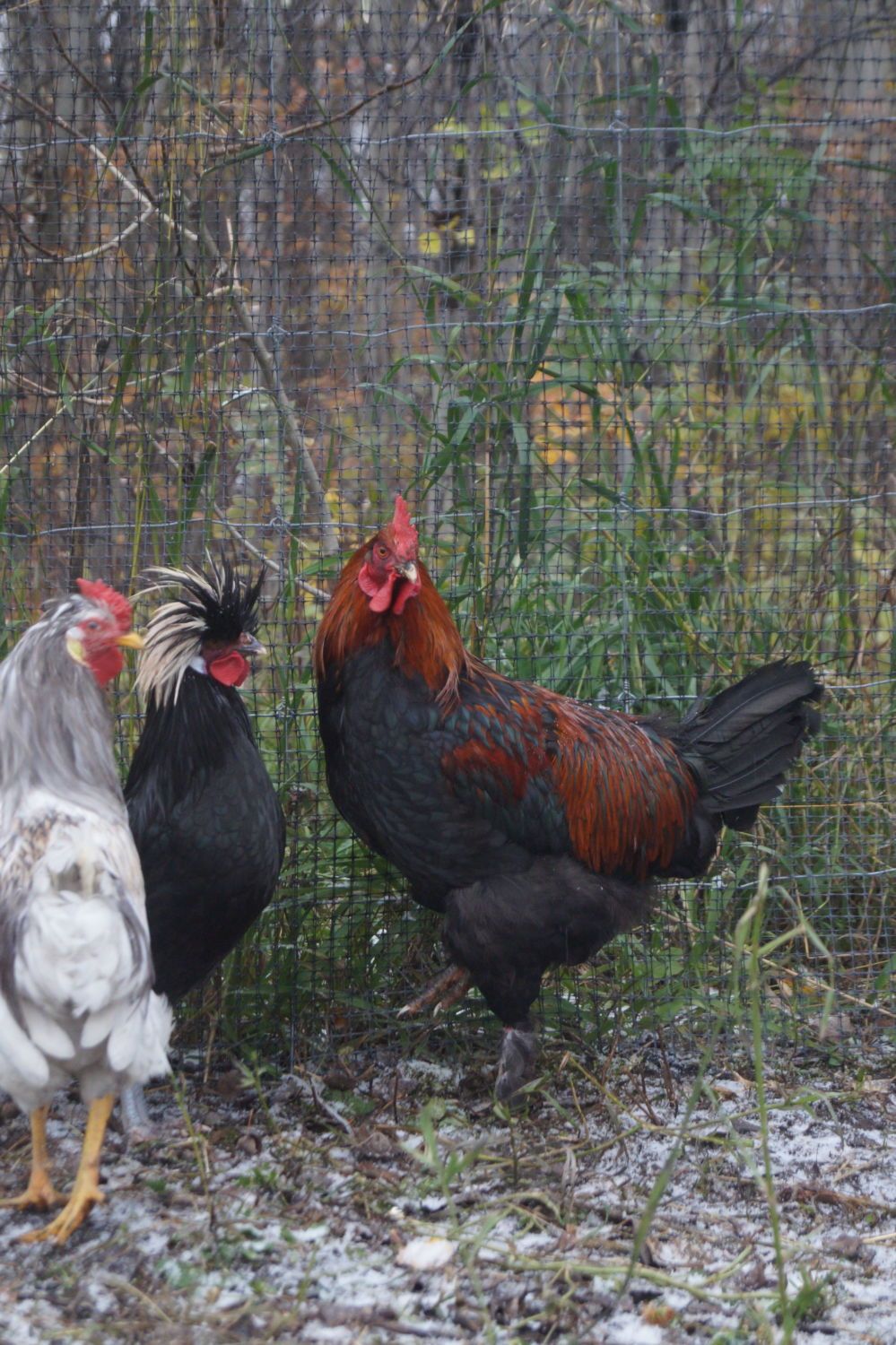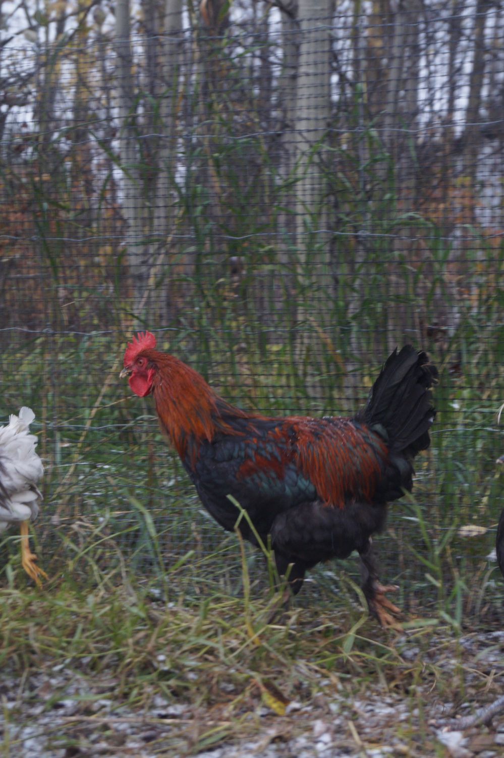 Actually, you can kind of see him behind the big grey mixed rooster here. His comb is crooked in the front unfortunately.