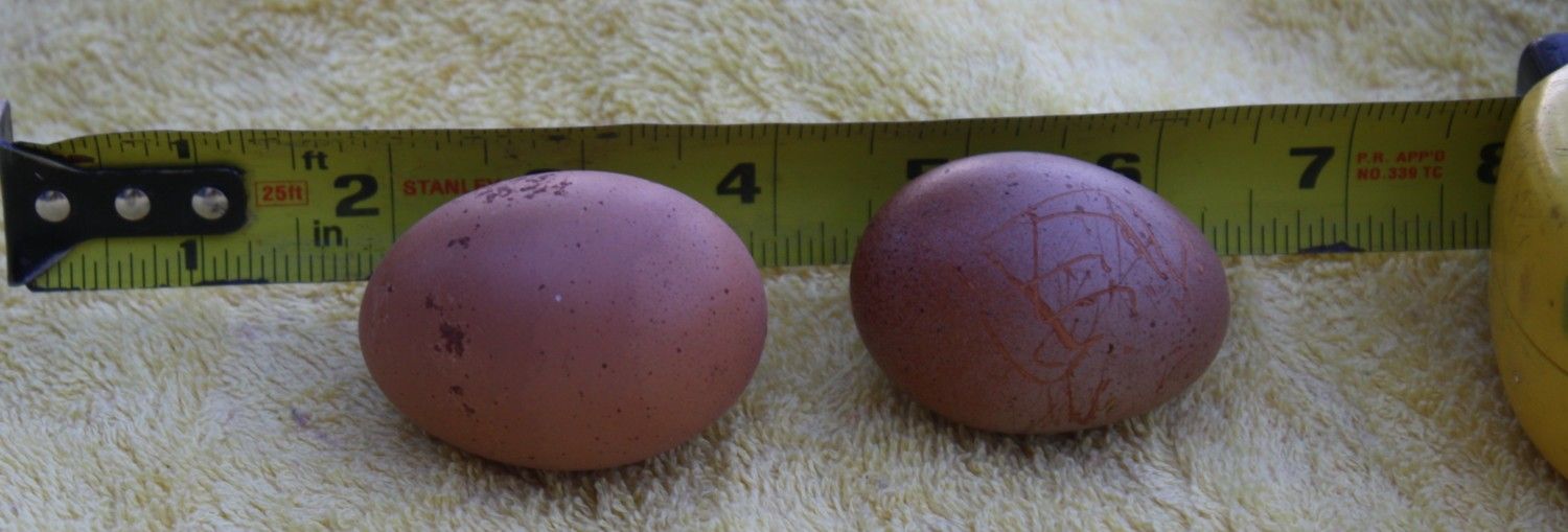 Well, I *think* I might have a precocious BCM. One does have a pretty red comb and the boys have been chasing her. Yesterday I found the little egg on the right and today I found the slightly bigger one on the left.