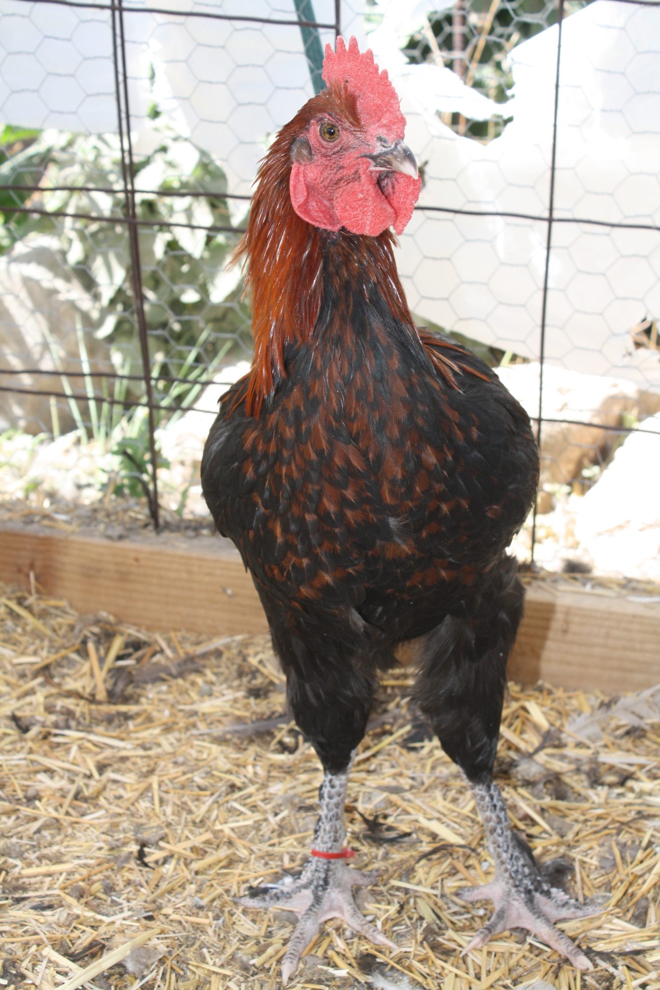 I got all these as chicks. All were black and white, but some had a lot less white, especially around the face, than others.I went out last night to see if my wheatens have brown wing feathers yet, and some of them do not so i am kinda thinking you have a wheaten there or maybe BCM x wheaten .. did you see him as a chick?? wheaten chicks are yellow..