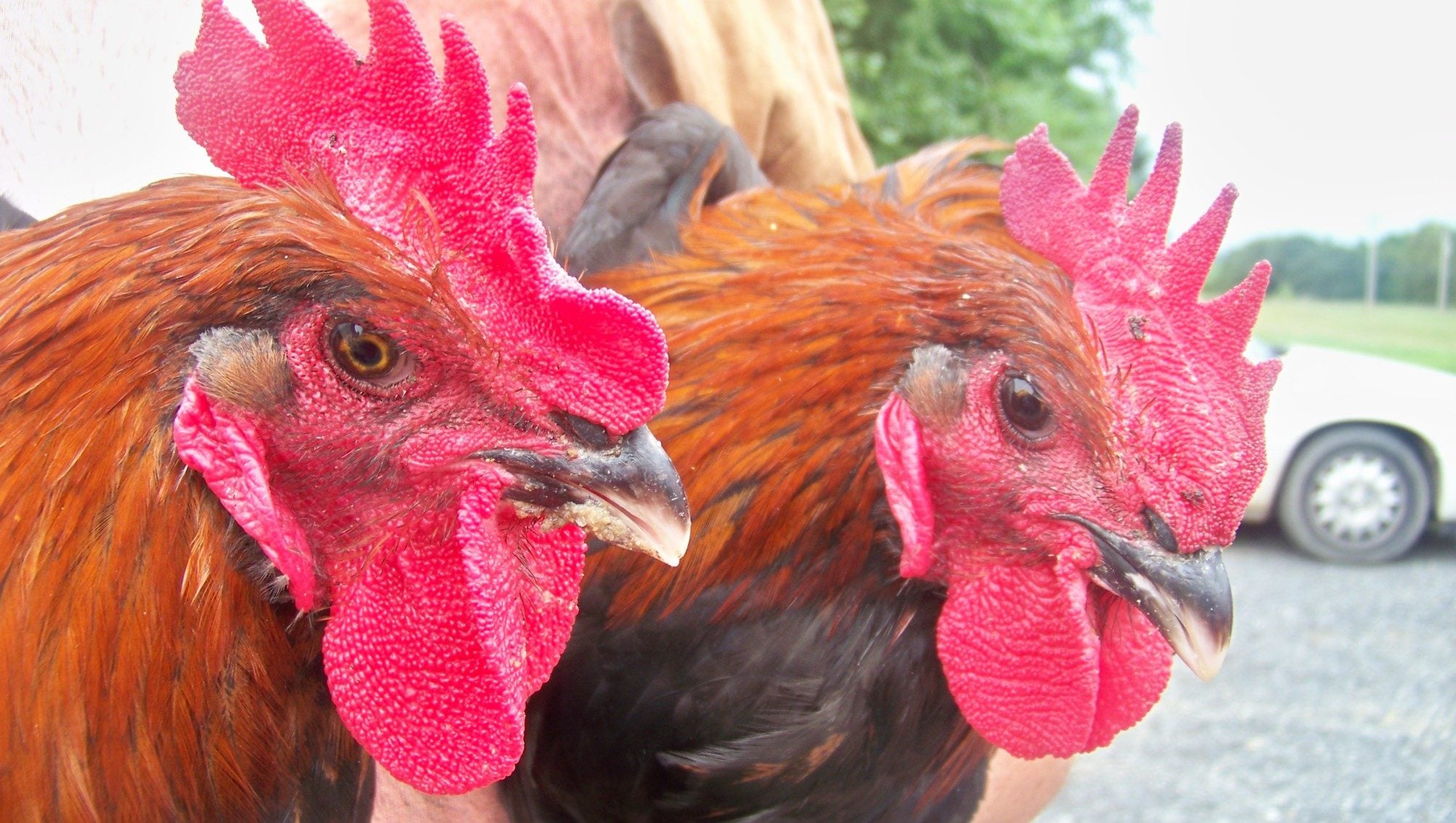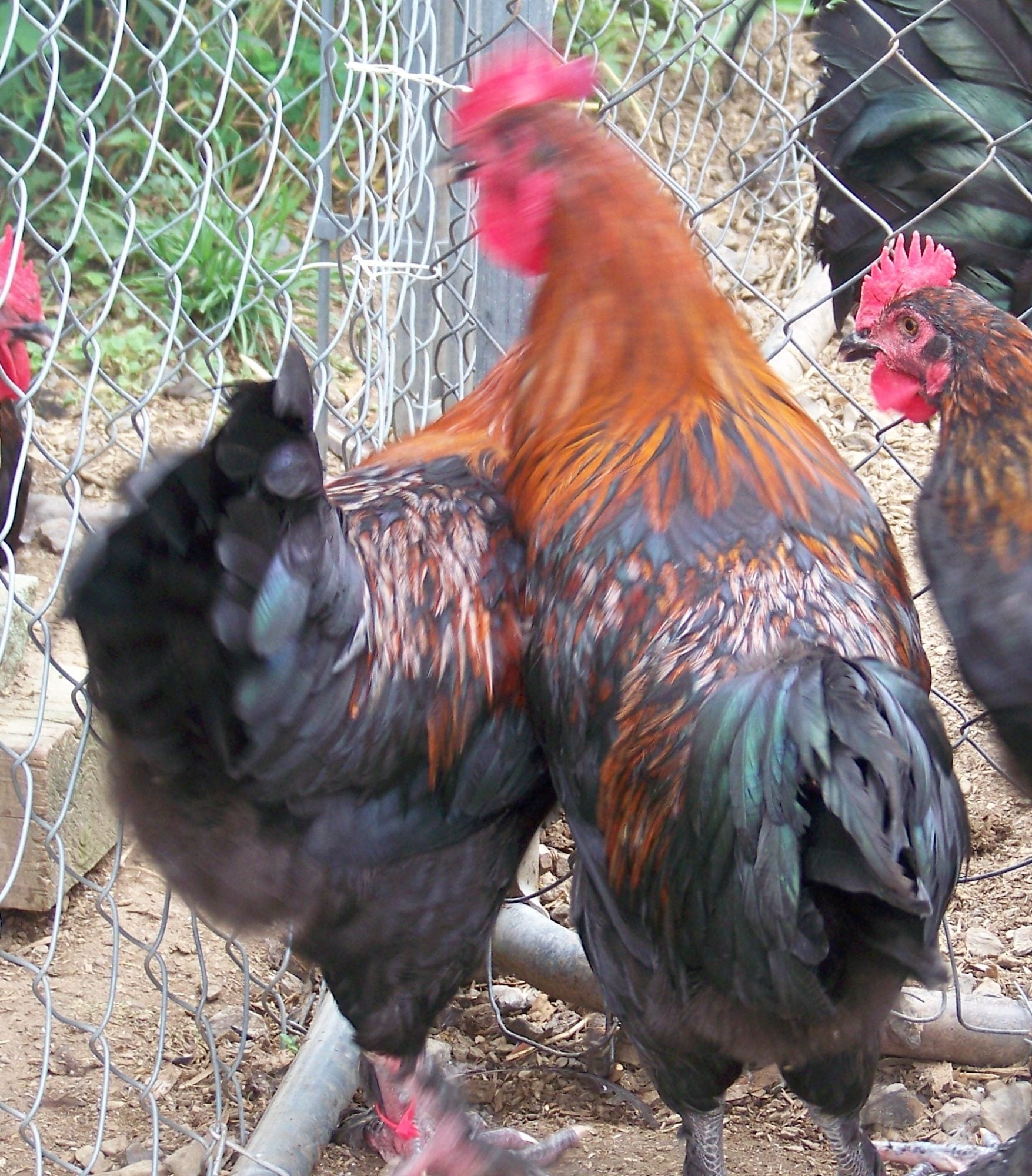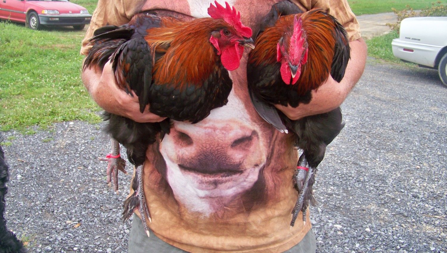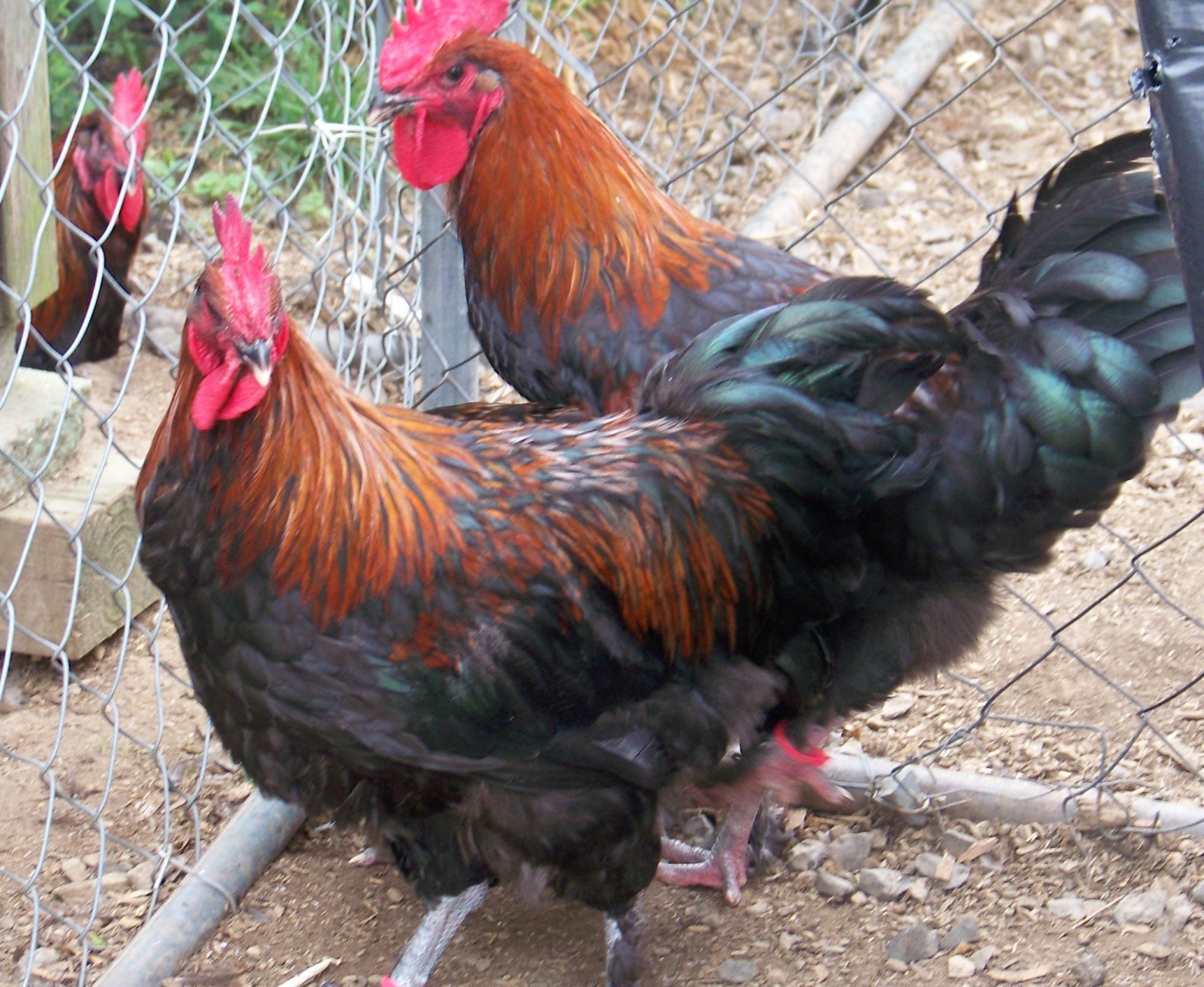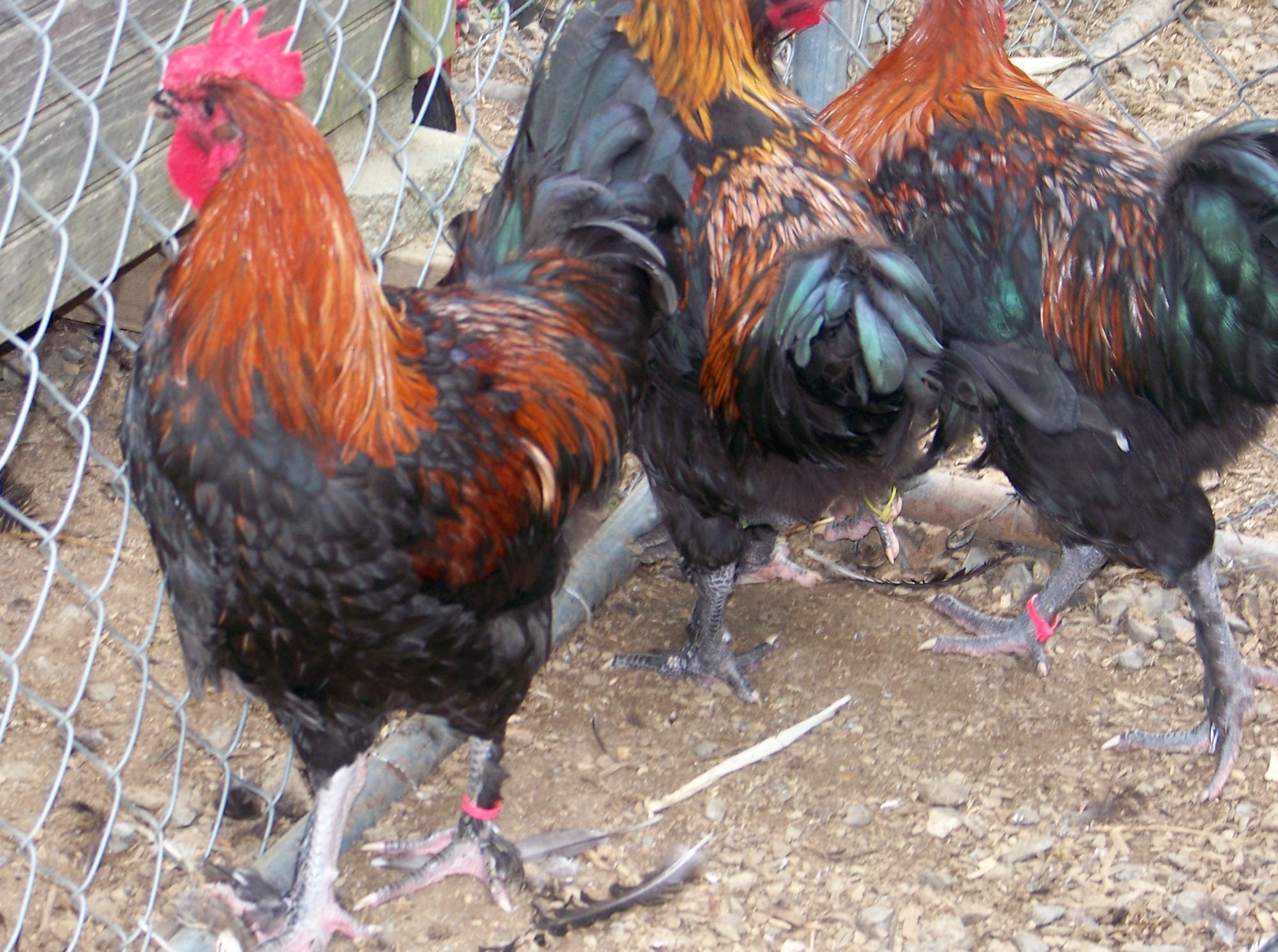 I hope these are the same two roos DH was holding ( We have 13 in the pen so you understand the confusion.) Ignore any with a yellow tag: we have already nixed that one. Pink tags mean =possible keepers. The heavier one of these roos holds his tail a bit straighter up and I fear it is too high. This strain doesn't have mossiness in the chest so we don't need to cull for that. Please... bring on the critiques.