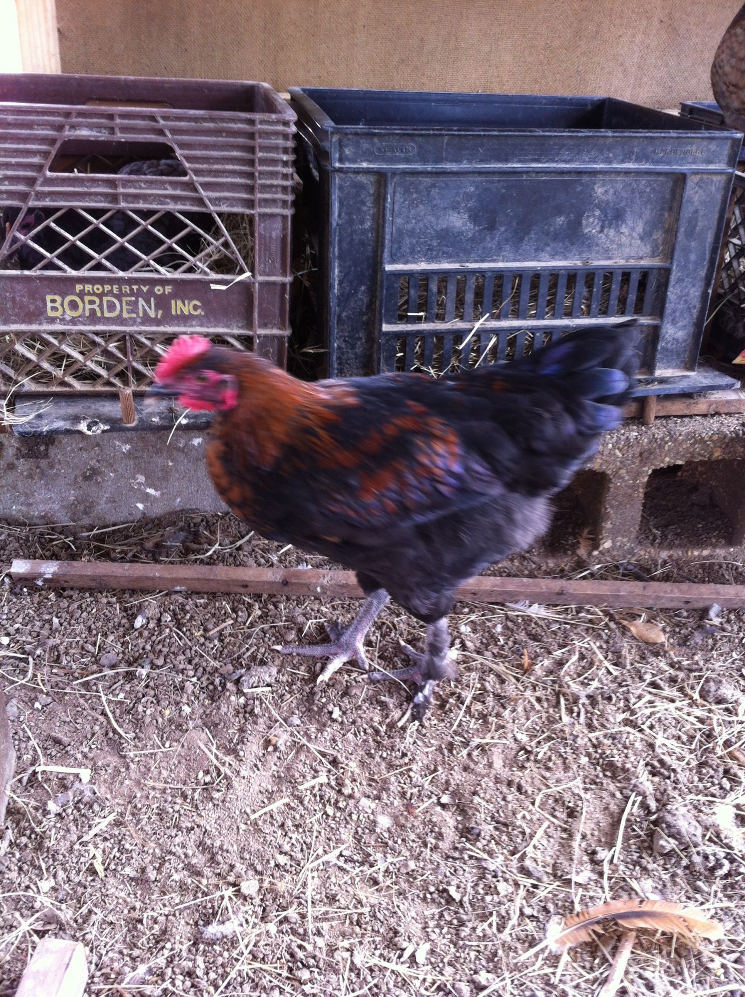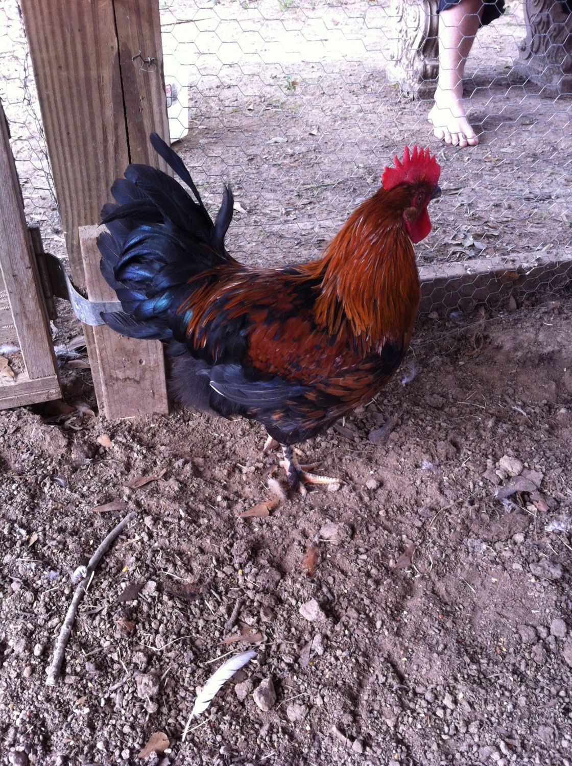 Good feathering on feet(only on the outside) but kinda sparse, and the back has way too much copper. They only want copper on the neck hackles. They will want to see the breast. The body looks good, good tail angle. The white feather on the side is not good as an adult.