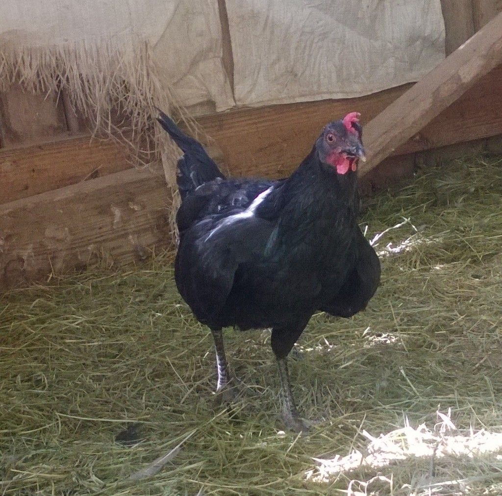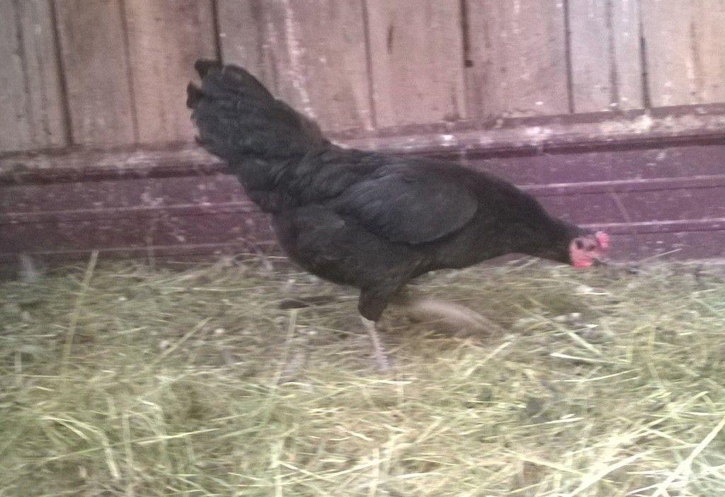 I have no idea what these 2 girls are, black Sexlinks maybe? I've never had them, so I have no idea. They seem to have a more of a Leghorn shape (not very meaty), which is whats making me unsure. They have a few bits of gold in their hackle feathers, single combs and slate colored shanks. They lay medium sized cream colored eggs just about everyday.