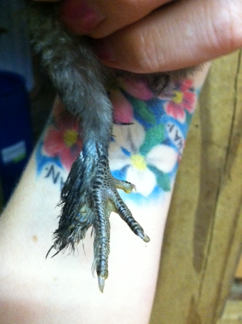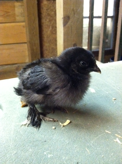 They are a couple weeks old and are solid jet black, except for a small white spot on their chest. Black feathered legs, black beak, 4 toes, very pretty but I have no idea what they are. The first feathers are starting to come in solid black as well.