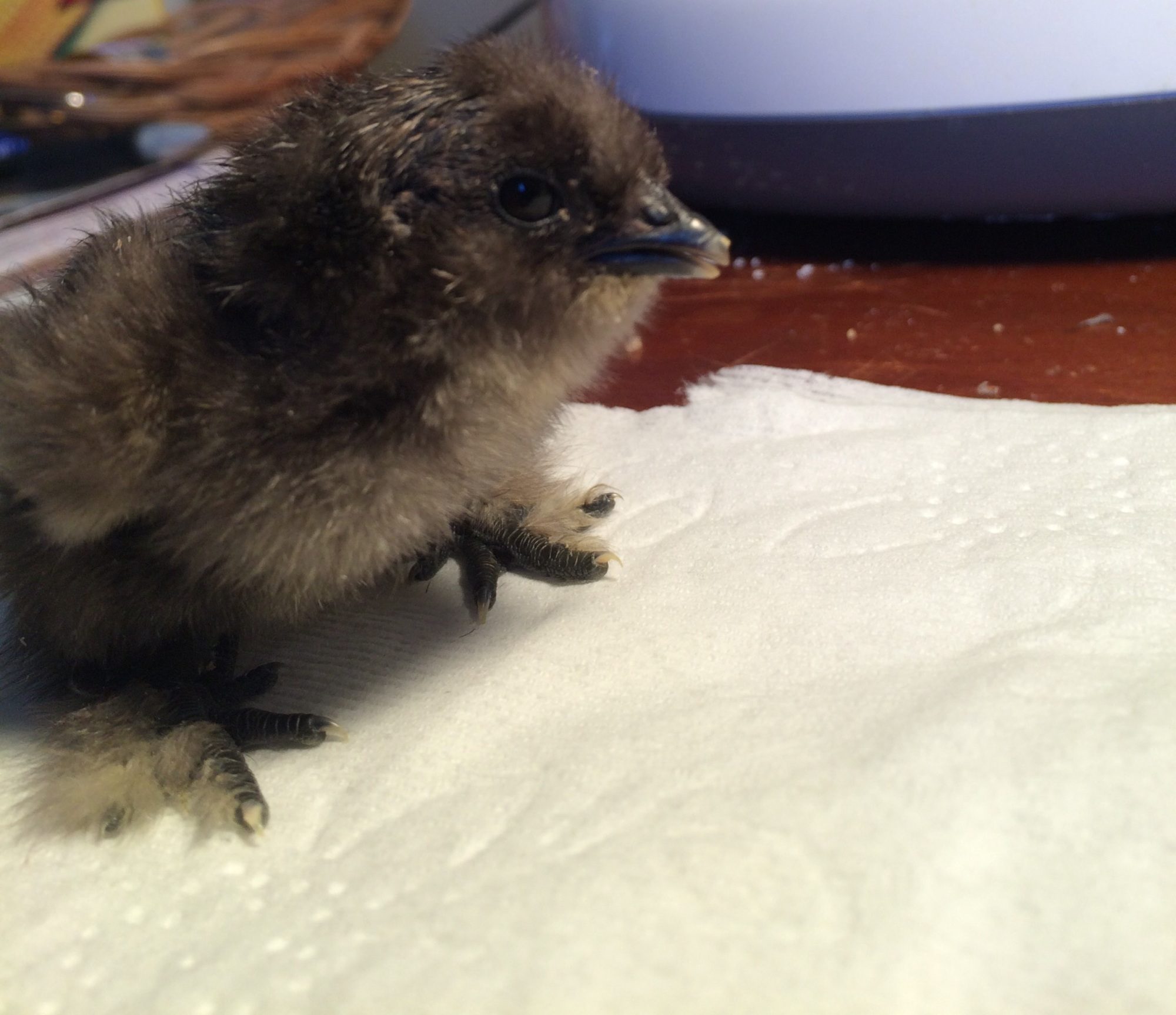 This is Wish! She's a little blue silkie chick who is surprisingly very active and very talkative. After taking a rest overnight, she has recovered from the long and stressful hatch. I have her in the incubator now, but will probably move her to the broody with the other chicks soon. Sadly, only 4 have hatched from my fifteen eggs that I set and one died from what looks like being stepped on by the broody. Should I be concerned for my other chicks? I have another broody hen I could move them to that is much older and more experienced, but don't want to cause them any stress. Here's little Wish: