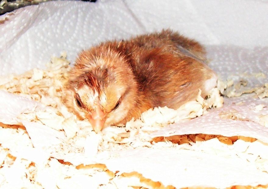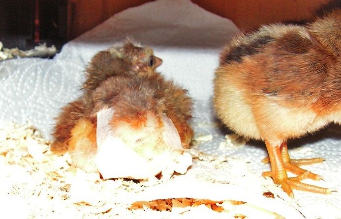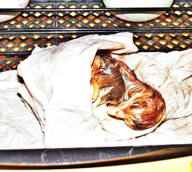 Adorable!! So glad he pulled through and is a happy, healthy chick.As promised some pic's, only this chick turned out to be a boy not a girl when it was finally dried lol. One happy chick though who's sitting with its siblings under the brooder.In the Bator, the remains of the egg is under the paper Towel.to stay moist and stop it from drying out.