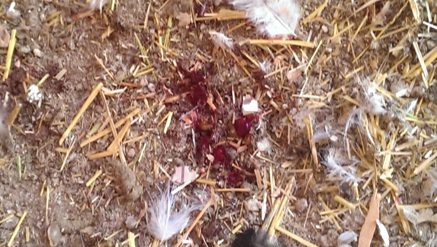 Today when I went out to the coop the silkies are all covered in blood. I tracked the one down with the face injury and it's healling well. I started looking around for the injured chicken, but found nothing. My silkies are young and haven't quite figured out roosting so they sleep in a pile under the roost bars. Looking at where they were sleeping I saw blood next to them as if someone on the roost above them was bleeding. (picture below)