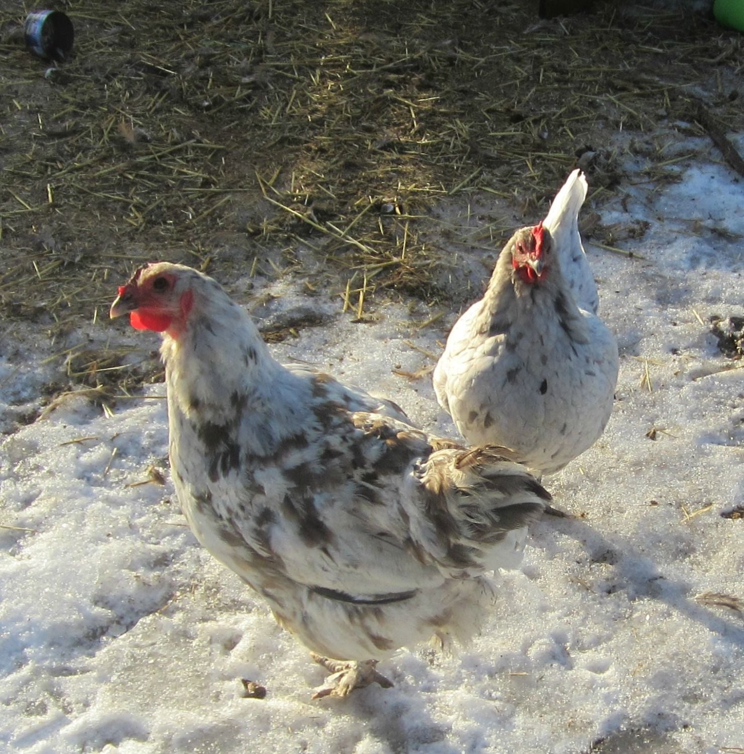 I have 2 chickens I have always called "blue and splash" marans- but they are not as big as a maran here is my True splash maran hen(front) with my splash hen. The Splash maran is missing her comb complements of a goose I owned.