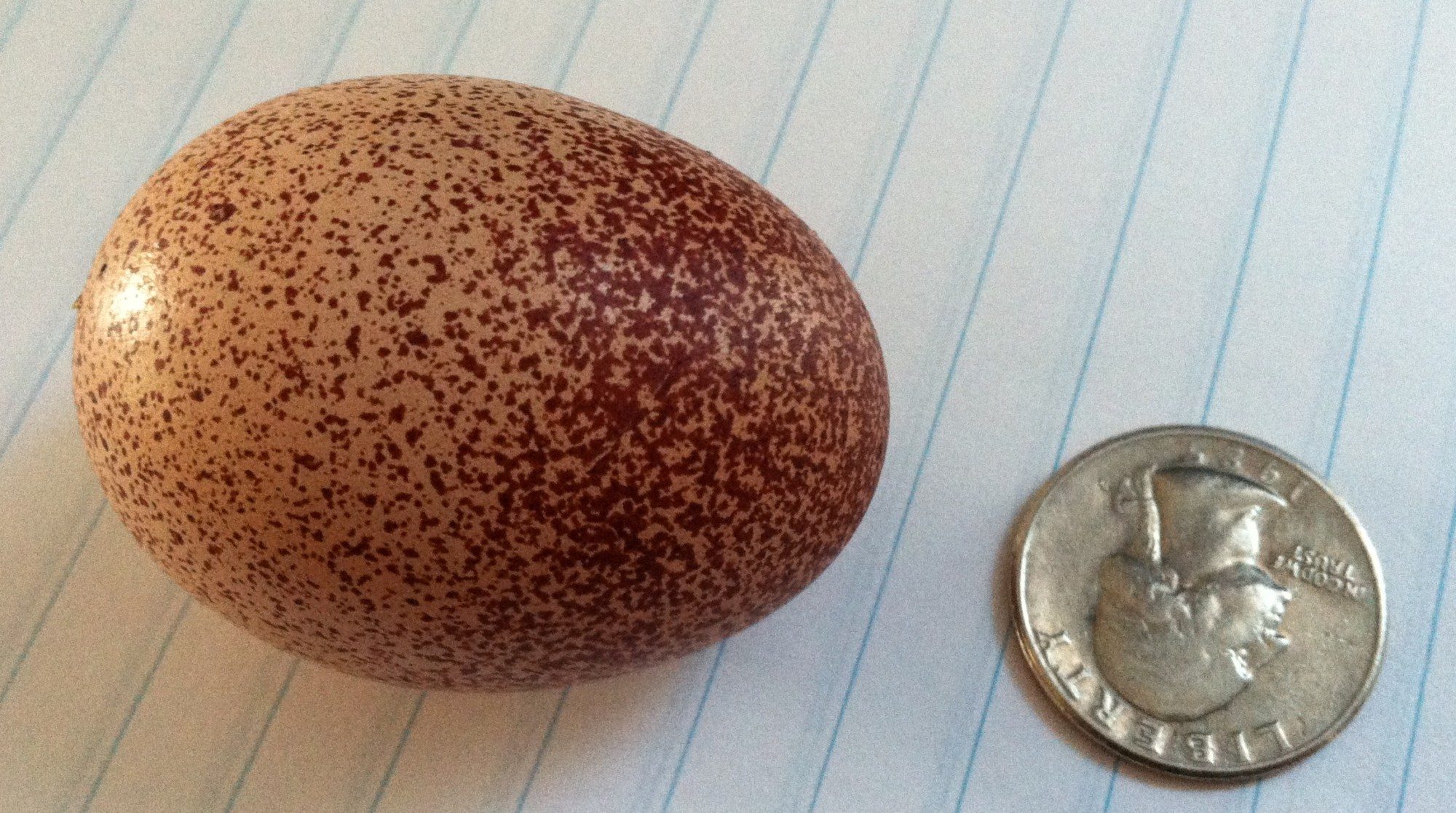 Here are her 1st three eggs, the 1st one I laid next to a quarter to show the size. Her latest one is about 1/4" taller than the one yesterday.