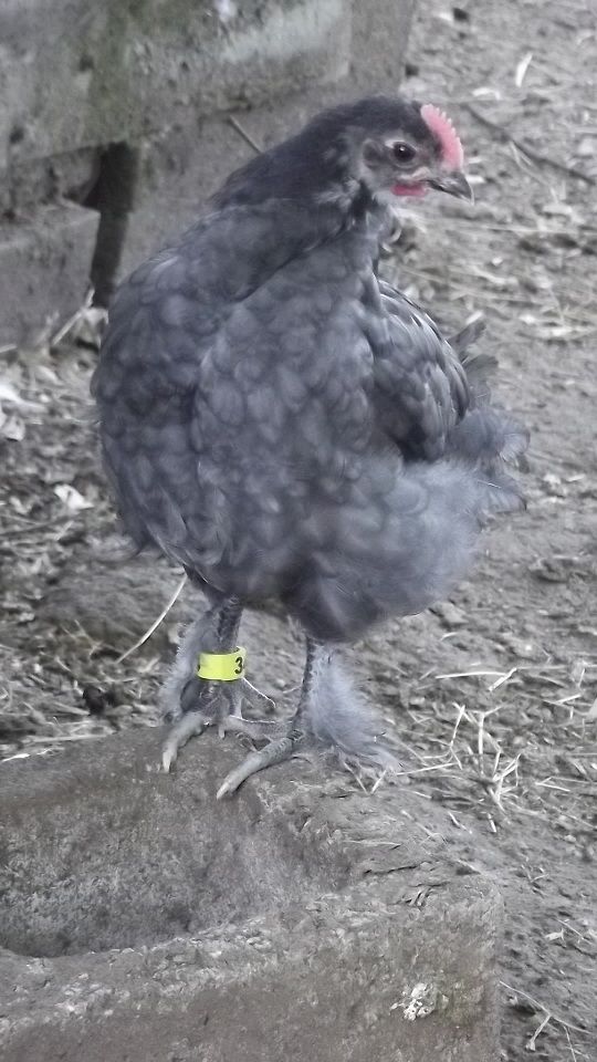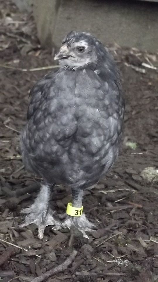 Out of the 5 yellow banded chicks, 2 of them #34 cockerel and #31 pullet are a lighter medium toned blue with nice edging coming along.