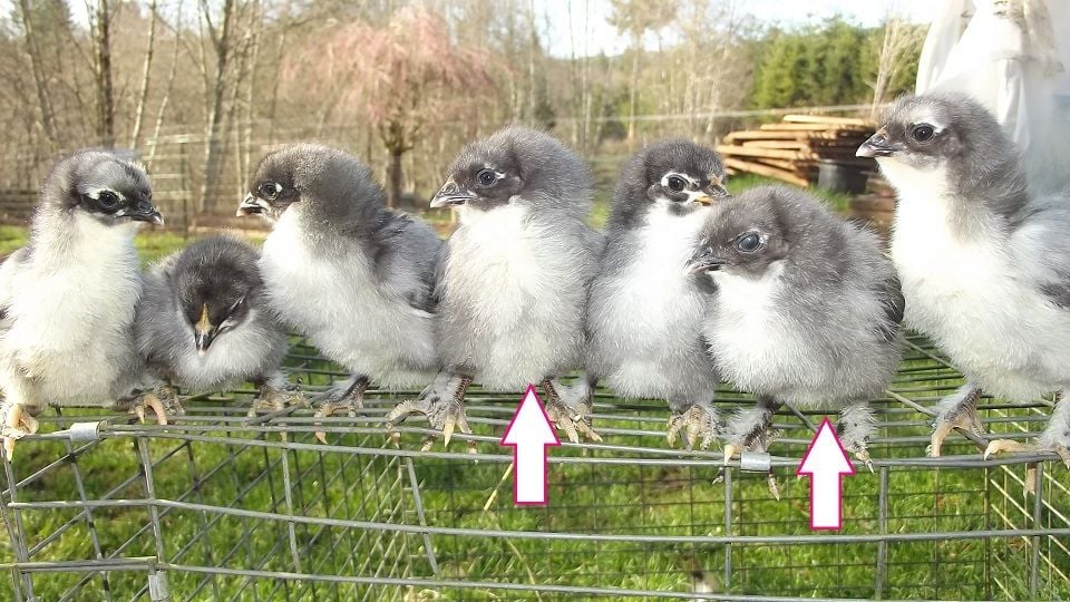 Here they are again at a week old. The 2 pink arrows are the 2 pullets that are banded pink.