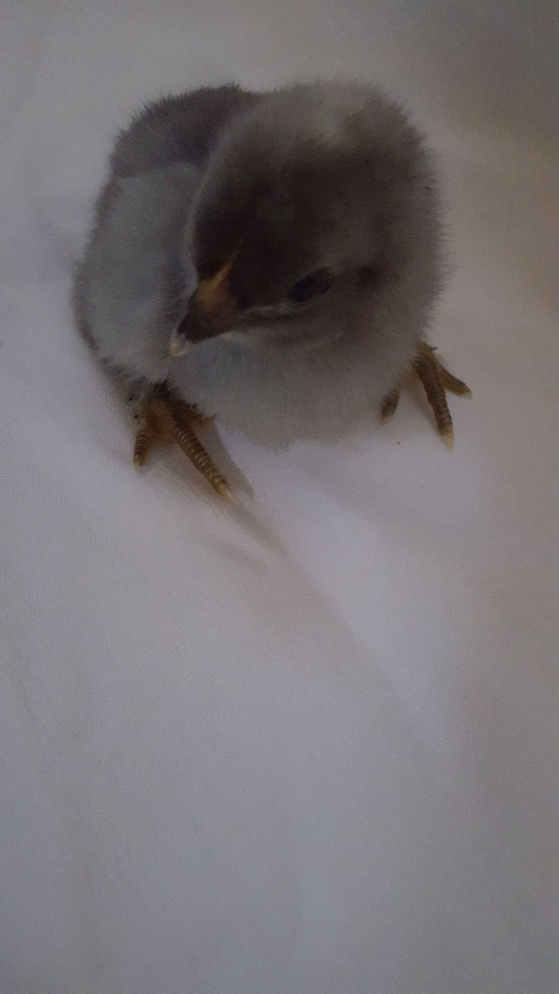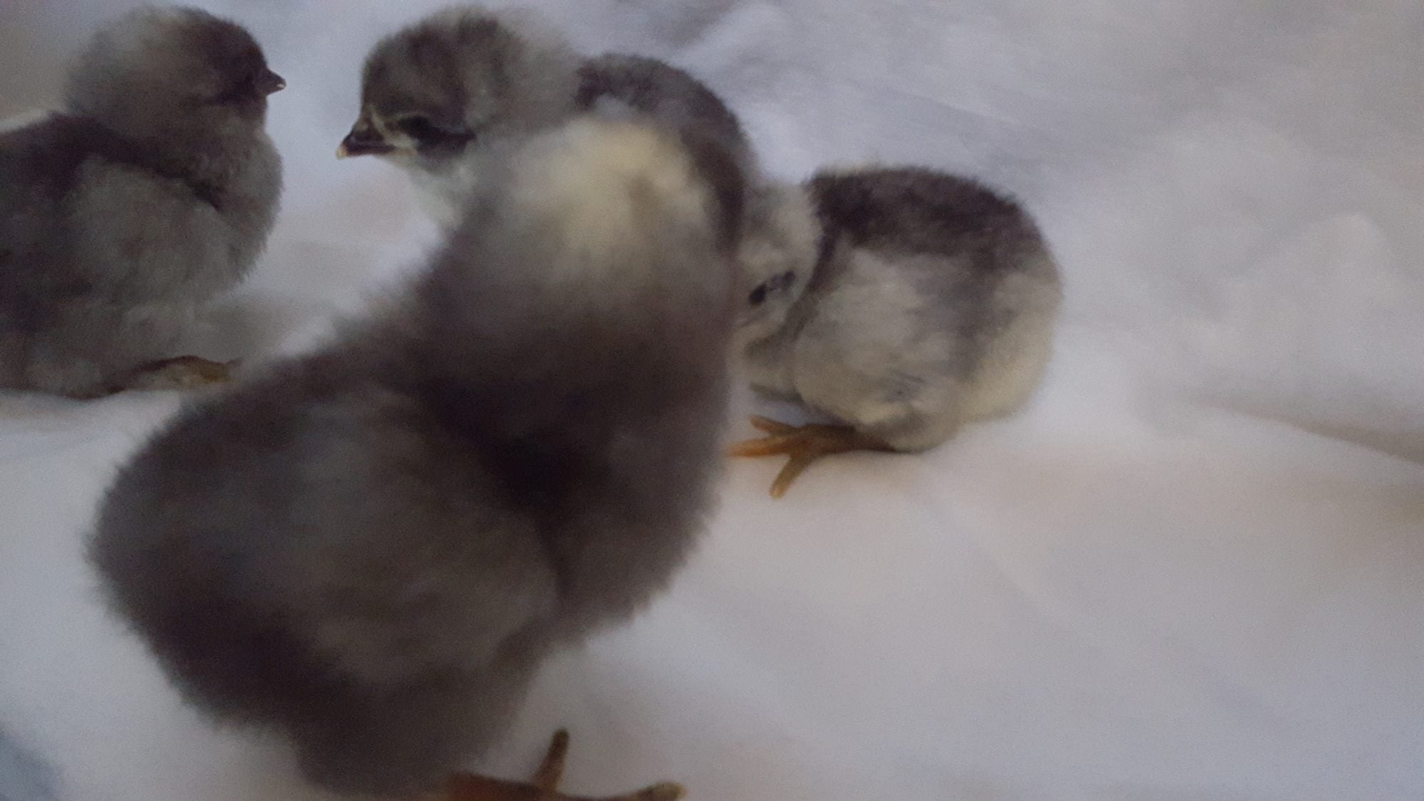 I purchased a "Breeders Choice" of eggs, and upon hatch, received these beautiful blueish/grey chicks, two have feathered legs. Does anyone have any idea what breed they might be? I also see a lemony yellow dot on two of the four heads, and think that is a way to tell if they are male or female.