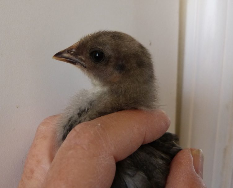 This chick has the dark eyes, I think it is a pullet hatched 2/14. the mother an original, the father -- from Omega Hills Farms has dark brown eyes -- not the ones that look black.