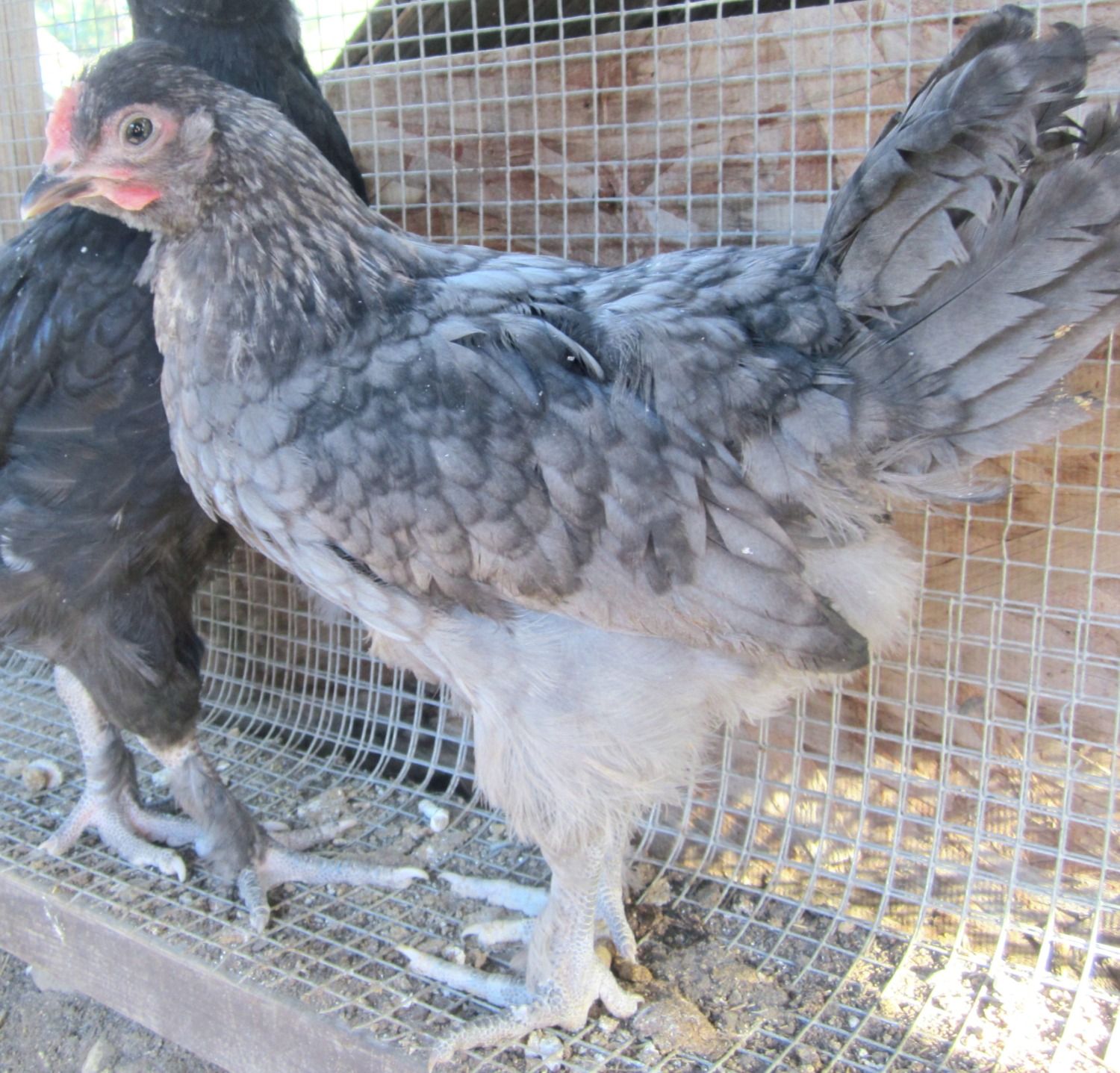I was asking about this HEN, no feathers on leg, HER dad was an australorp, the mom was a blue Isbar or lavender orpington, I was asking which you guys thought, blue isbar or lavender orpington.