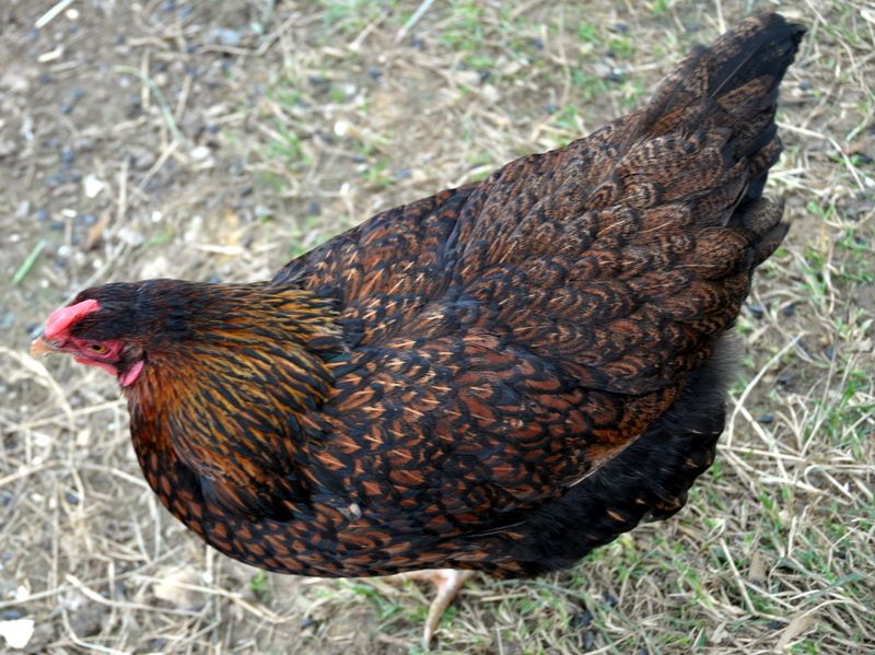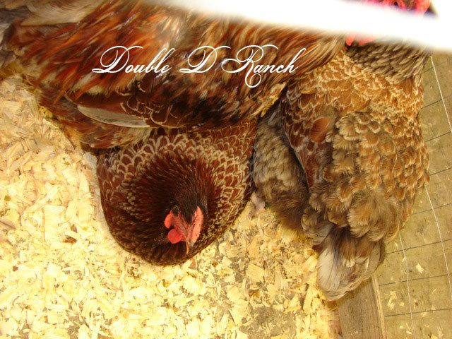 The one I am talking about is on the RIGHT side of this pic.... her feathers were in bad shape when I got her. She molted all the feathers on her back near her tail and on her chest. She still has bad feathers on her upper back. The penciling is on her BREAST feathers. they look like Penciled feathers in the center (black and red) and then there is the BLUE lacing on the outer edge. Hard to explain. I looked at it again today and it has a pattern just like penciling.
