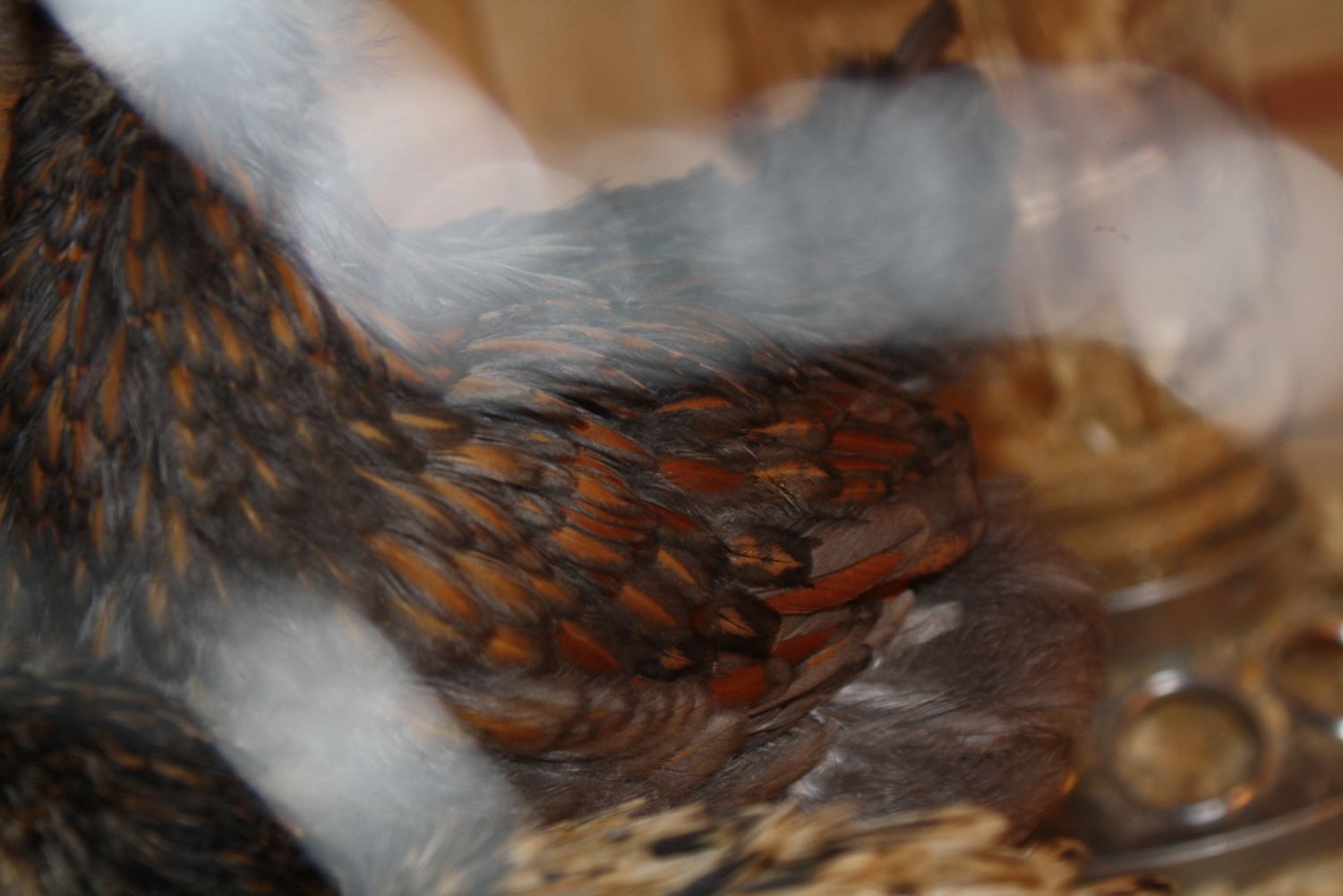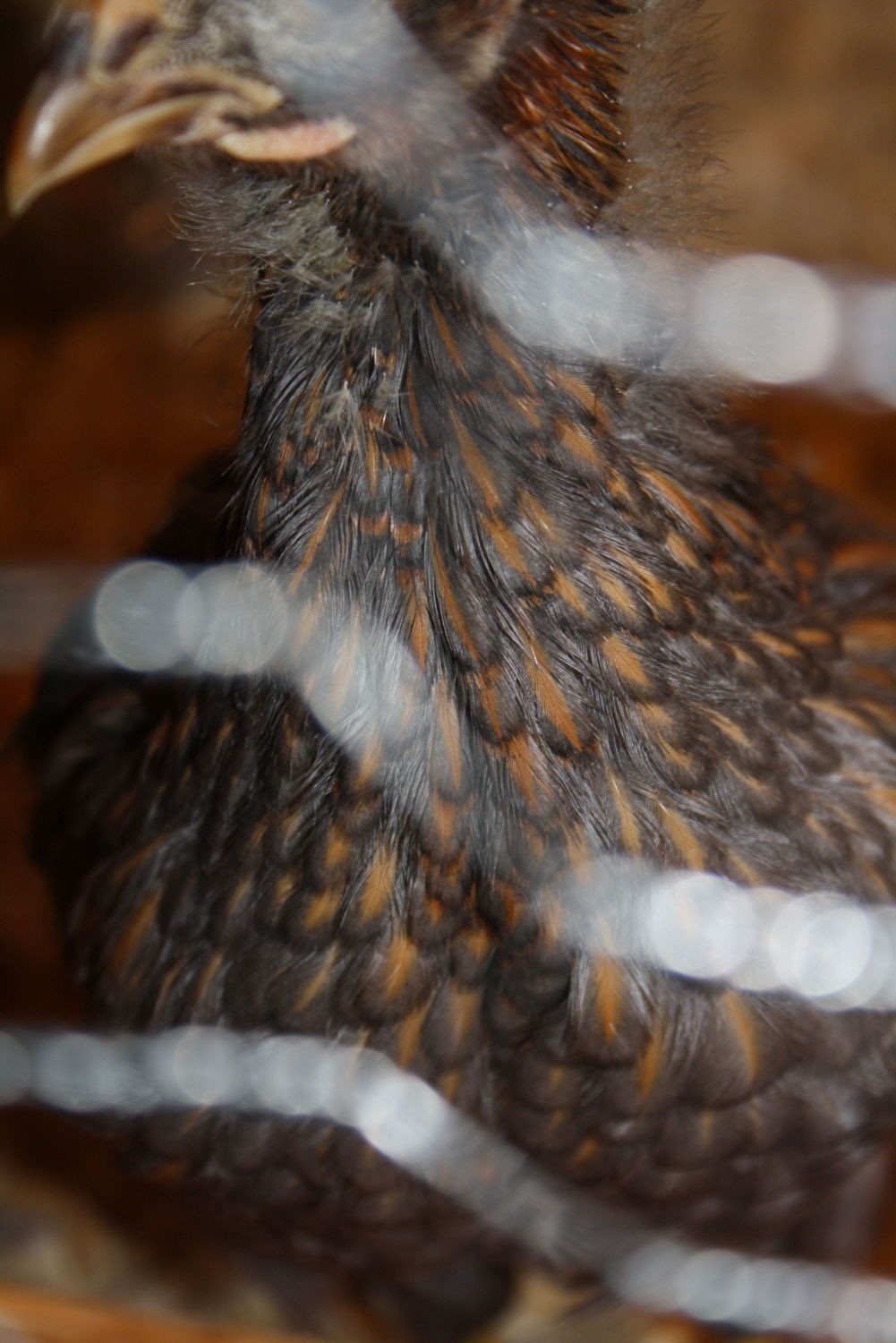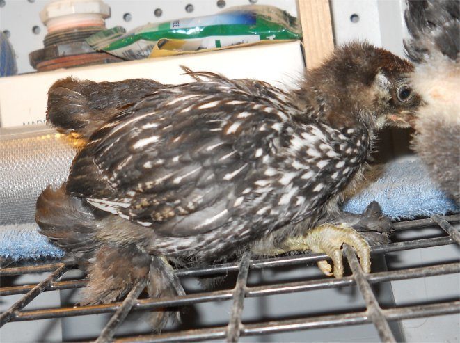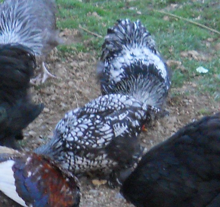 also, donna, hens have more complete lacing all over, not the narrow stripe this guy's showing. my silver laced cochin roos show a narrow strip in the first feathers then clear out as they mature. sorry for the non-wyandotte pics, but i don't have any other pics showing the good contrast like this.