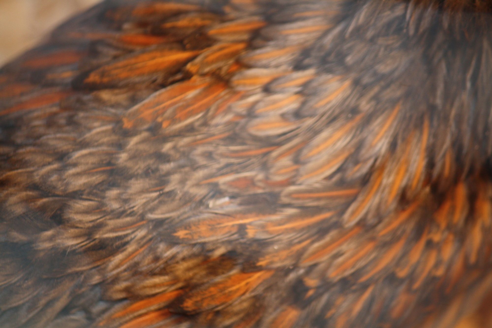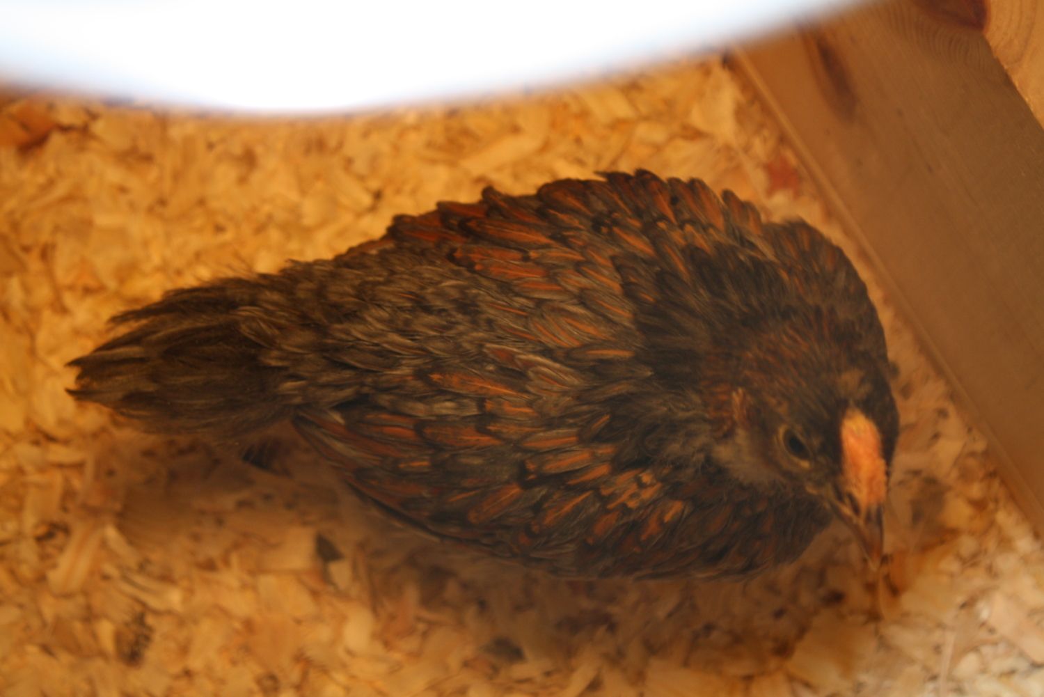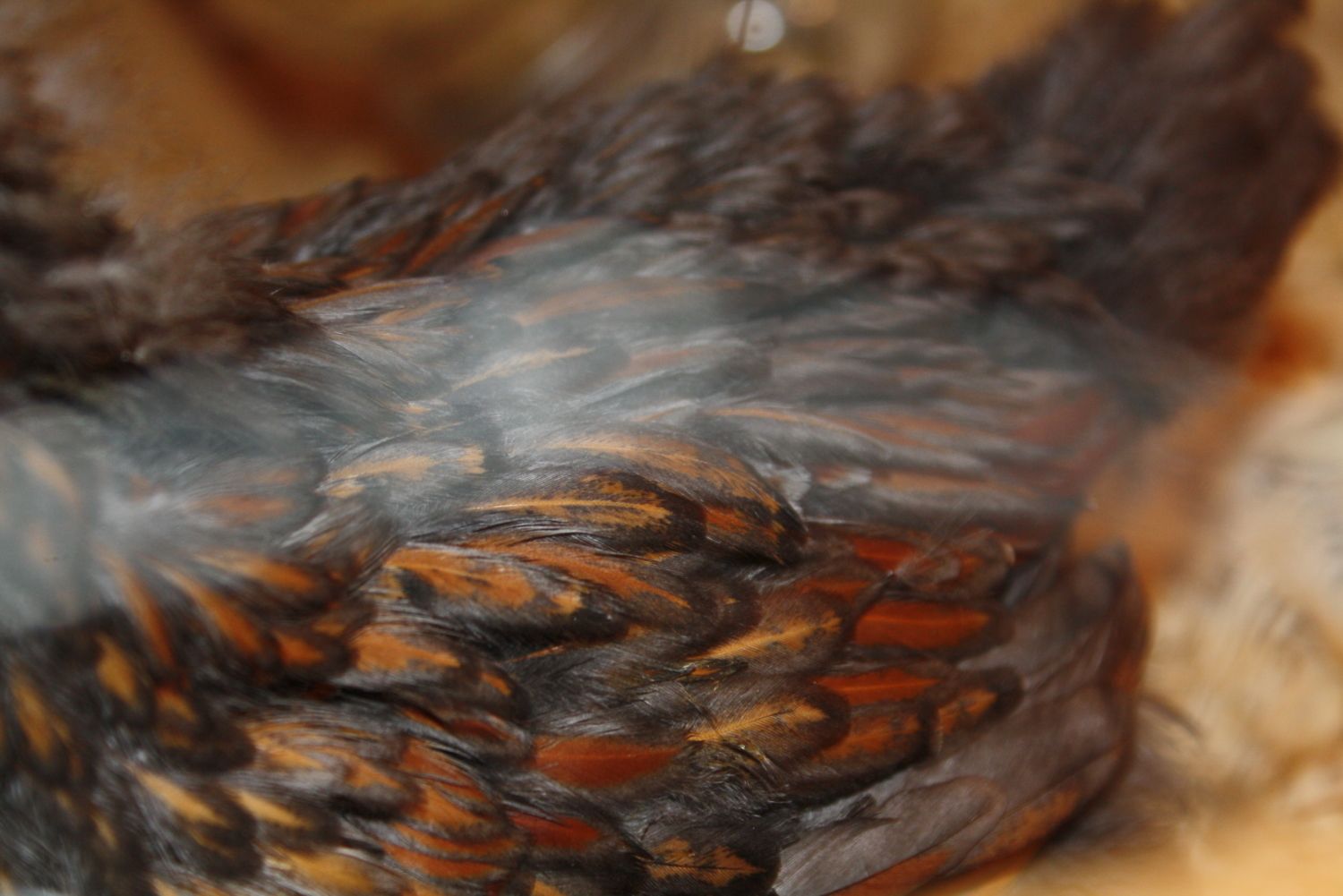 also, donna, hens have more complete lacing all over, not the narrow stripe this guy's showing. my silver laced cochin roos show a narrow strip in the first feathers then clear out as they mature. sorry for the non-wyandotte pics, but i don't have any other pics showing the good contrast like this.