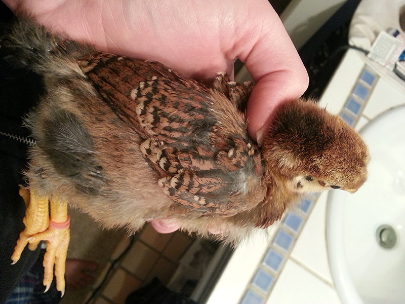 I hatched them myself, I have Foley Hen/pullets but unsure of main roos lines. I did just purchase another roo and 2 more pullets for next year. I hatched many out this year and just never had any with that pattern is why I am confused. I'm breeding blue to blue and the chick shown is my only blue chick, the rest were black laced and I didn't get any splash.