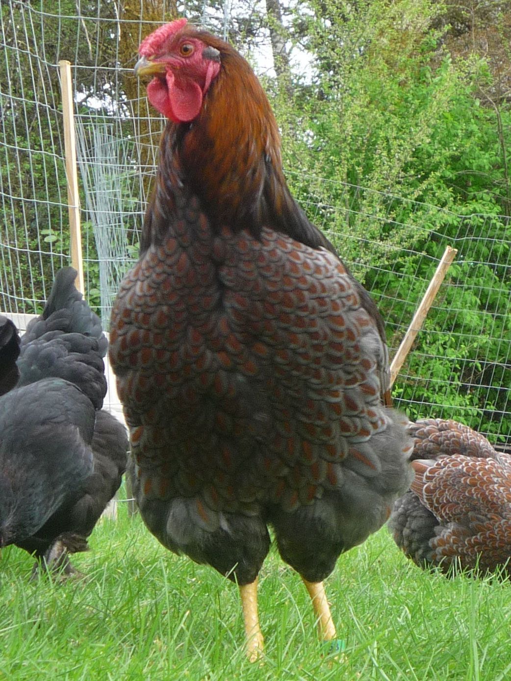 I do not like the copperness of his hackles either..... there is a subtle under layer that looks a little darker orangered, you might be able to see it on his chest where the hackles meet, maybe not. still not the right red though. it is the type stuff I have trouble identifying. I am not sure if the chest roundness will come with time, or if it is what it is. first time raising a rooster, so time will tell of course, but maybe someone with an eye can see something I can't