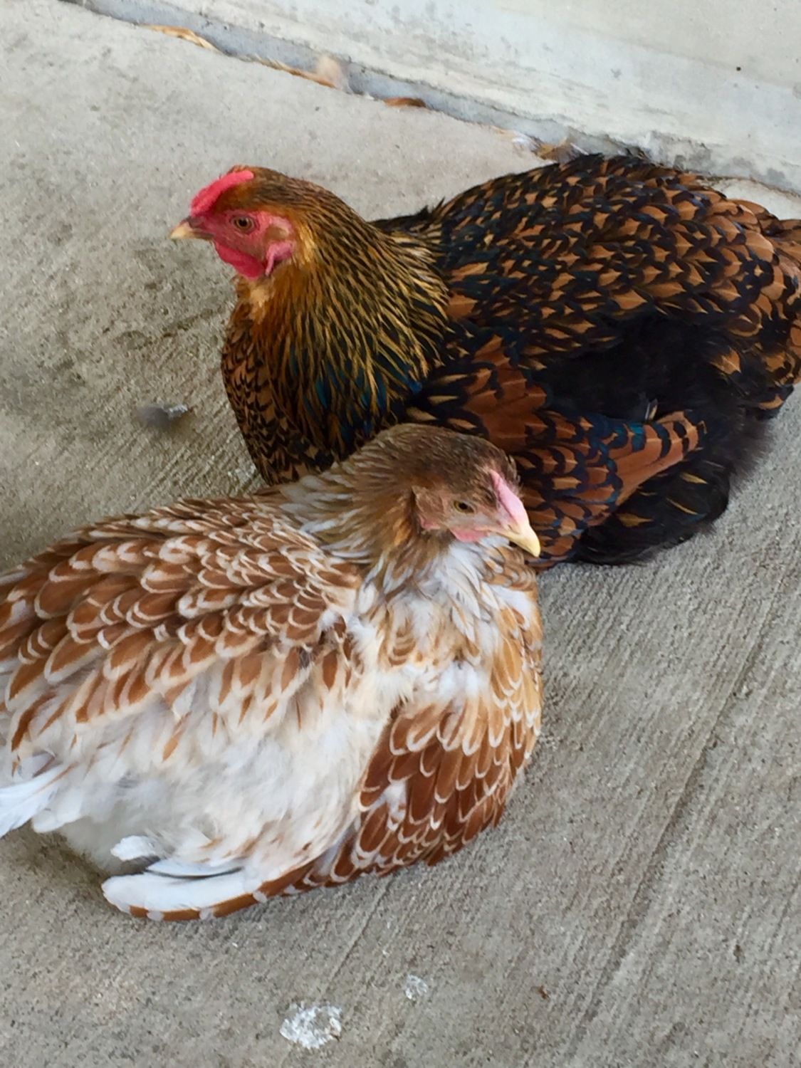 Stella's color is called Golden Laced......both girls look normal to me but I am no expert. My Wyandotte & Orpington pullets seem to grow at varying rates (ones from same clutches) and some have darker combs, some lighter. If both are eating normally....in good weight, no nasal/discharge and no sneezing........im sure they're just fine.I'm hoping someone in this thread might be able to help me figure out how old our new BLRW is. I am new to backyard chicken raising and purchased two Wyandotte's from a lady not far from us. When I picked them up on 9/9/16 I noticed that the blue laced was considerably smaller than the black laced. Both were supposed to be 20 weeks old, clearly this was not the case. Stella is the black laced and Gertie is the blue laced red. Gertie began her juvenile molt about 2 days after we put them in quarantine and is now growing her adult feathers, but her comb is so pale compared to Stella's, I'm worried and want to make sure there's nothing wrong with her. This might be normal for the breed, but I want to be sure. She acts normal, eats and has perfect poops. I don't know if they lady I got them from wormed them or not, but I don't see signs of worms and neither has mites (but I dusted them when we got them to be sure). After flock intro and integration about 3 weeks ago, Stella began laying consistently so I'm guessing Stella is about 24 weeks old. I'm also wondering if Stella is a black laced gold as I'm not positive she is a black laced red. We have never raised hens from chicks so we have no idea how they look at certain ages. The 4 adult hens we already had were adopted as adults this past March (RIR, leghorn and 2 EEs). Here's a pic, I'm hoping folks with far more experience with Wyandotte's can help us determine how old Gertie might be and whether the color of her comb is normal for her age. We want to make sure there's nothing wrong with her:![]()