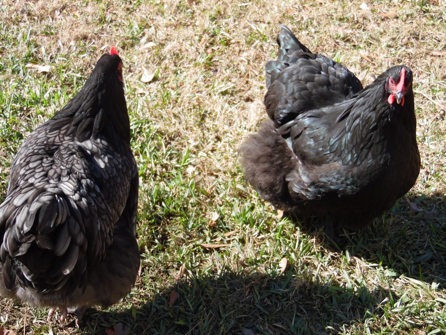 Just took this pic of Miss Duncan and Cookie our black pullet. Can y'all see why I have been going back and forth on what color she is? I said earlier that she does not have the green sheen that a black orp has but in the sunlight she does. Even her lacing has a bit of that iridescent sheen. Maybe I should try to breed a "Blue Smoke" Orpington variety.