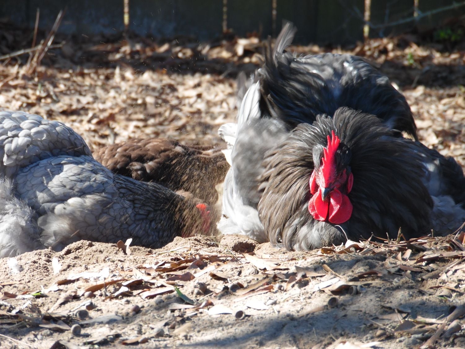 Thanks! I will definitely look at her pin bones. I have signed up with our local BYC club to participate in our annual breed showcase and I was thinking of taking Miss Duncan so I better get busy and do some research on how the Blues came about since I will have to give a presentation on her. You are right about them being large birds. Our Buff hens are only 5.5-6.0 lbs and our 7 month old BBS pullets are 6.0-7.0 lbs already. They look like giants next to our Buffs! Our 7 month old Blue Cockrel is 9.5 lbs already! I am guessing he will top out at around 14lbs. He is a hunky chunky sweet thing. Here is a pic I took this morning of he and two of his favorite girls dust bathing. He really is amazing, perfectly behaved with his ladies and humans and beautiful to boot.