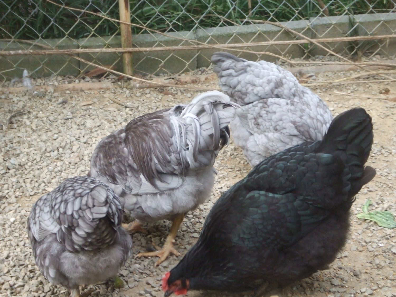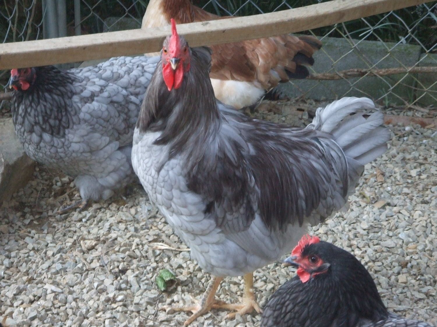 There hasn't been anything on this thread for a long time so I thought that I would share a few pics of my Easter hatch from the eggs that I got from "halo". They are almost 25 wks. old. There is one black pullet,two blue pullets and a blue cockerel. I have received many complements on these birds and hope to use them as a basis for my future flock. Any comments are welcome, good or not. I know others have hatched some blues and would like to see how they have turned out. If anyone knows why LF black rocks haven't been admitted to the SOP but the bantams have, I would like to know. Have a nice day, Charles.