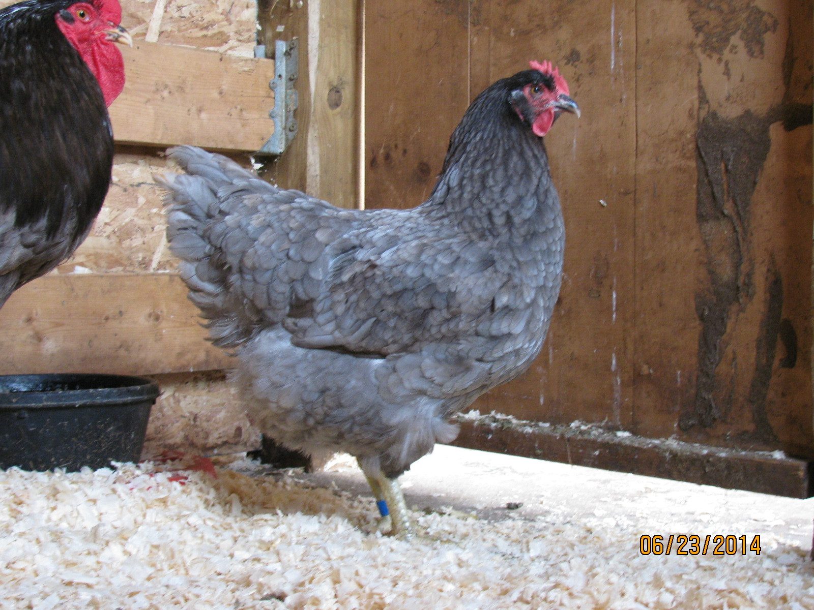 The hen of mine has no barring. In Findtex's bird below, I see barring not just in the hackle but throughout the body...it is probably most noticeable in the main tail and coverts. The barring gene is linked to yellow leg color (as opposed to dusky). Last year I mated a heterozygous (single copy) barred male over blue barred females. Both parents were yellow legged, but all of the solid (non-barred) pullets had leg color that ranged from dusky to slate. My hen above was the yellowest-shanked solid pullet of nearly 200 hatched. Selecting for yellow shanks on a solid blue bird, particularly females, is a genetic tightrope because it can lead to white undercolor and/or wing primaries. This is especially true when based on E (extended black) and the reason why the blue and black varieties of yellow-legged breeds are commonly double-mated (separate male and female lines).Very pretty. Is that barring in her neck, or is it just a trick of the light? I especially like those light yellow legs!![]()