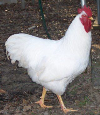 These are some very nice White Rock Large Fowl. One thing I noticed about this nice pen of Rocks was the condition or finish. You would not have to give them a bath to show them just put a little Vaseline on the legs and combs and look out. I have a picture of a male I had about ten years ago and this male reminds me of him. I named him Gladeator as he was the meanest fighter I ever riased he killed the best male I ever breed his brother in a fight . I took this picture of him when he was about six months old for his leg color. When I started the legs where creamy white but after selection of darker yellow in five years I got the color I wanted. For the record if you want to learn how to breed, hatch and raise Heritage Large Fowl this is the easy est breed I know of to learn from. Then after you give five years of work on this breed you could move on to Silver Penciled or Colombian Rocks or for any good breed. You have mastered breeding type to a level you can start focusing onto the color pattern. The prettier the color of the chicken the harder it is to breed.