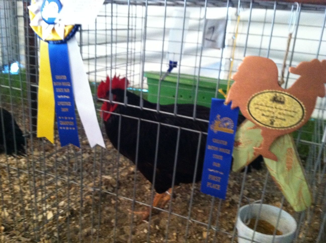 The RIR got first, best of breed and champion Cockerel. He was in the running for over all Champion but after about 20 minutes of going back and forth the Judge gave it to a Cochin LF.