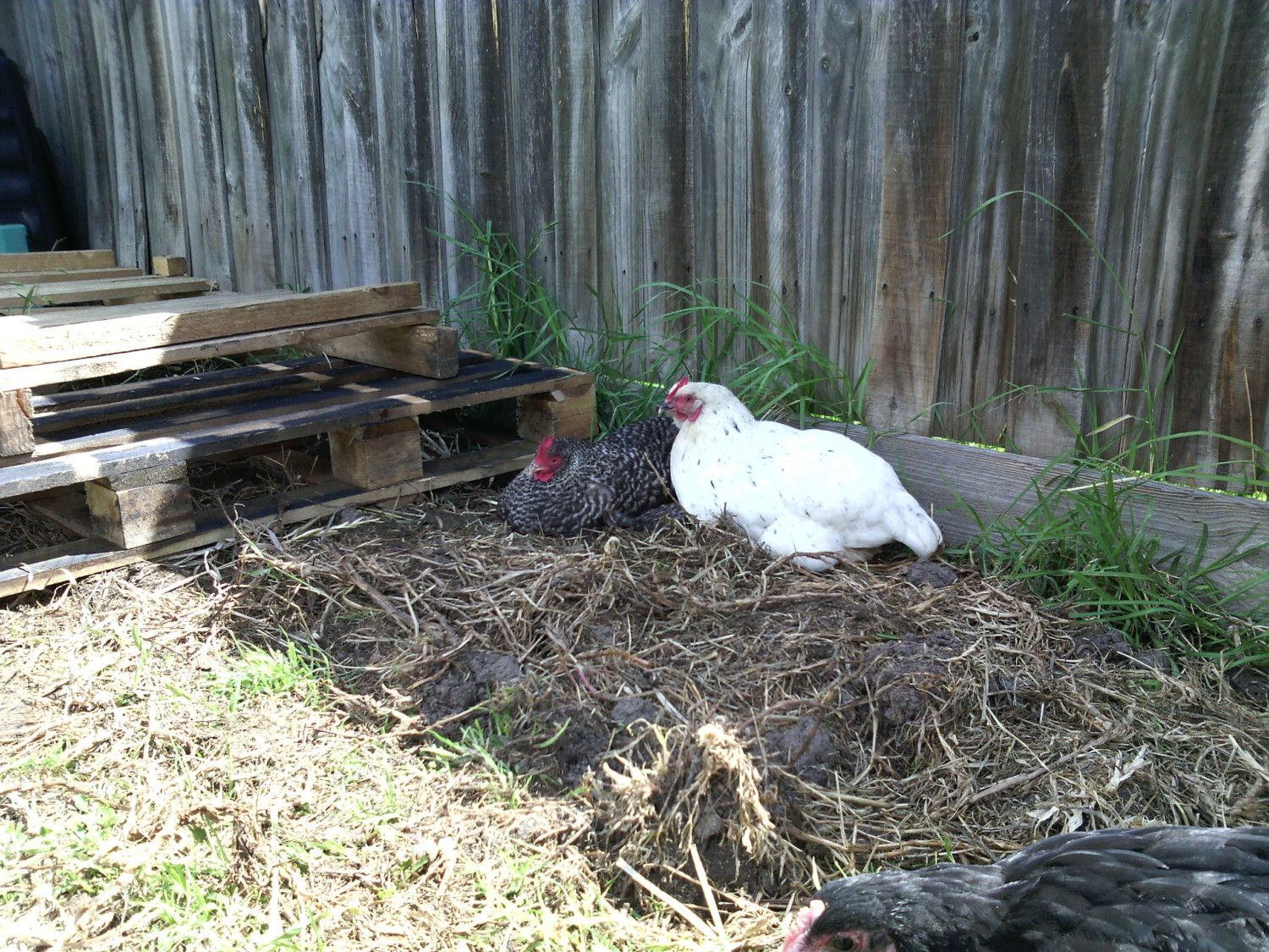 On the left (grey) is Spike (my husband named her) and she is the alpha hen. She doesn't even need to fight anybody about it she just looks at them and everyone runs for the edge of the fence line. She just sits around being grumpy, butting in when I feed them to eat and drink first, and doesn't allow anybody to roost on either of the two roosts in the coop. It's been over a week now and she hasn't layed any eggs while the others are all laying (except Brunhilde, and I'll get to her). Right now it's raining and Spike and Brunhilde are roosting in the coop and won't allow anybody else to come in.