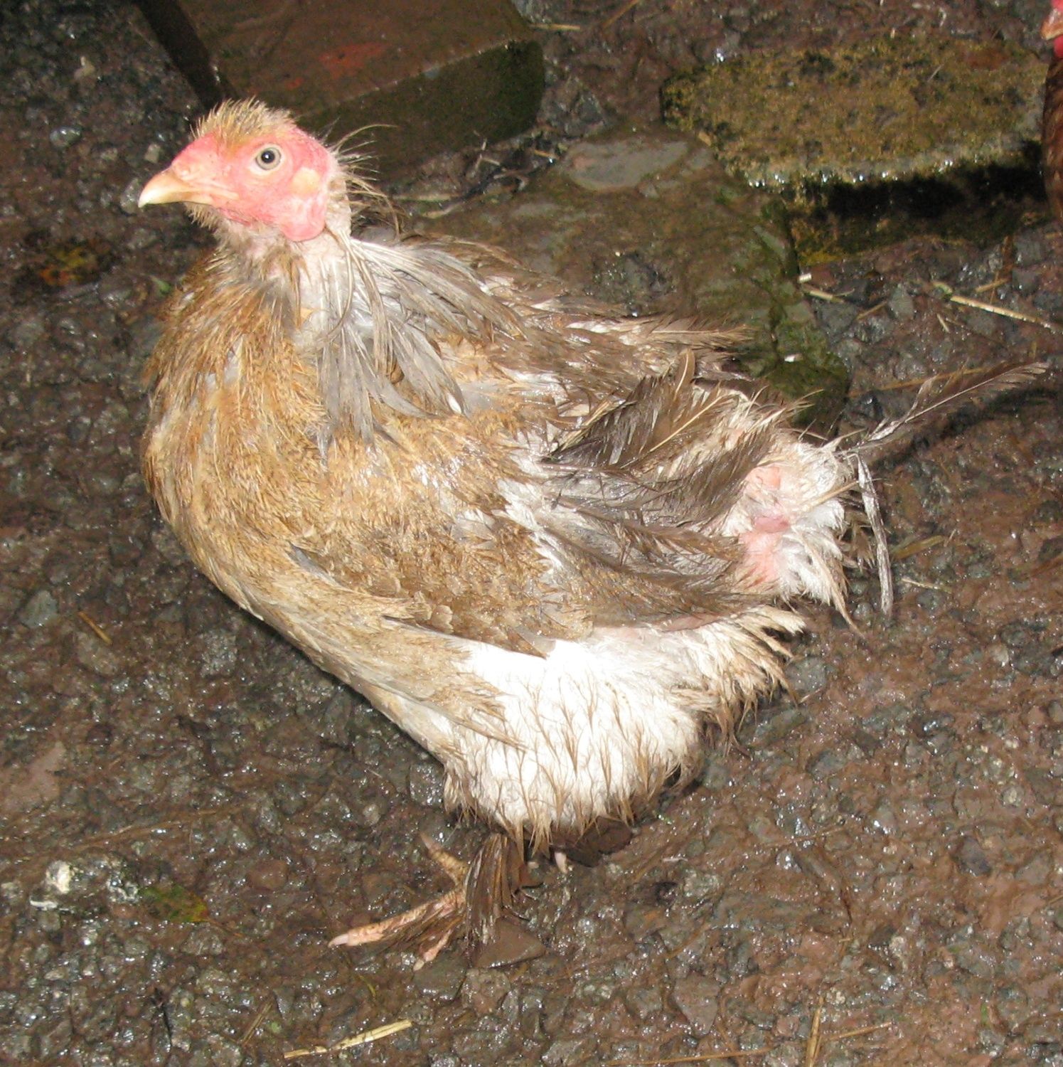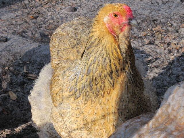 Having seen so many neat looking birds, I thought I'd post a pick of my Moel, Blue Partridge Brahma who is in a bad moult (yet continues to lay eggs).