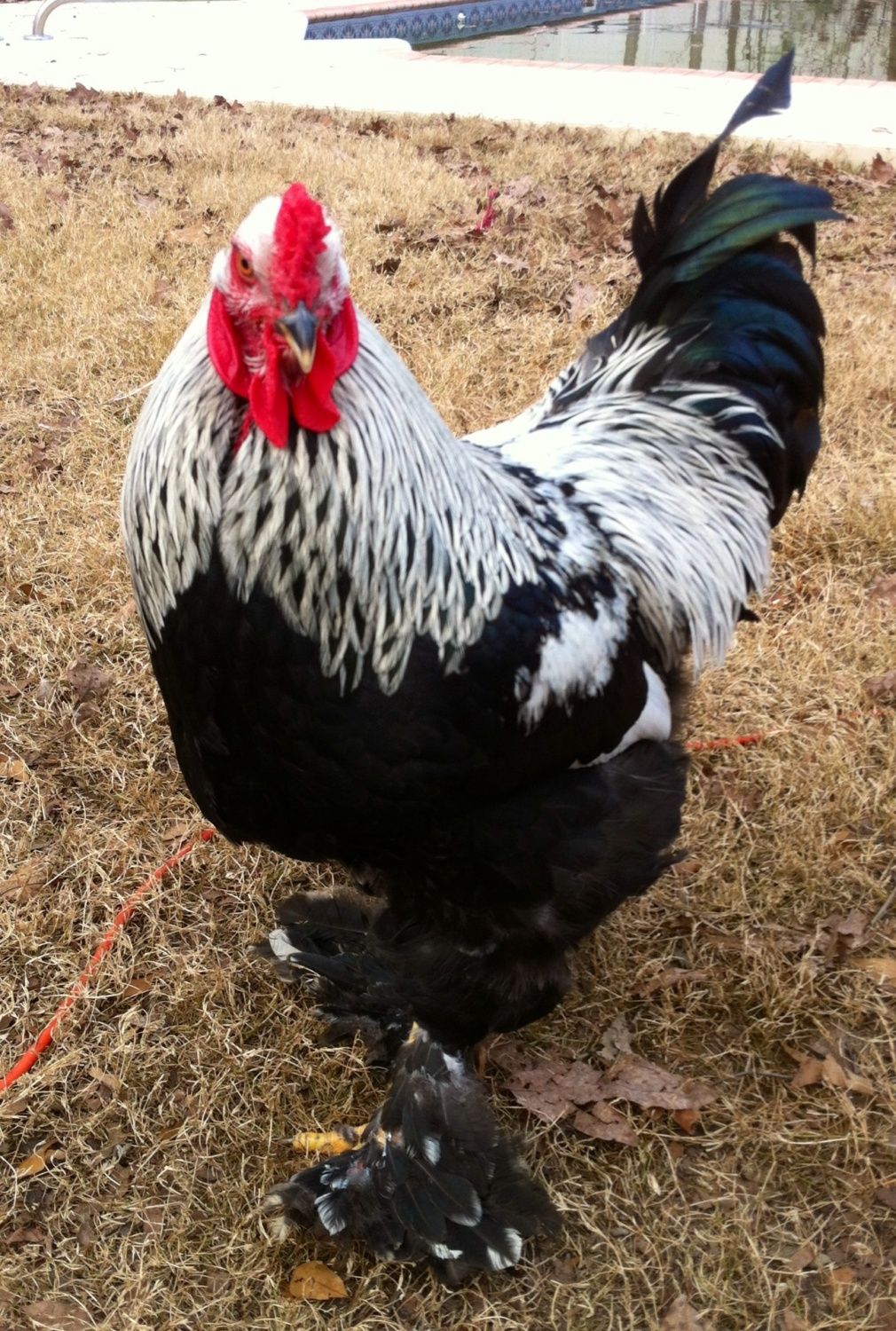 Honestly, he looks quite narrow over the saddle and through he tail. I have some nice LF Lights and from the rear, their tails have a 10 inch spread easily at the base. He seems to have adequate foot/shank feathering. I will try for pics of my lights this week. Someone with Darks can comment on his color.