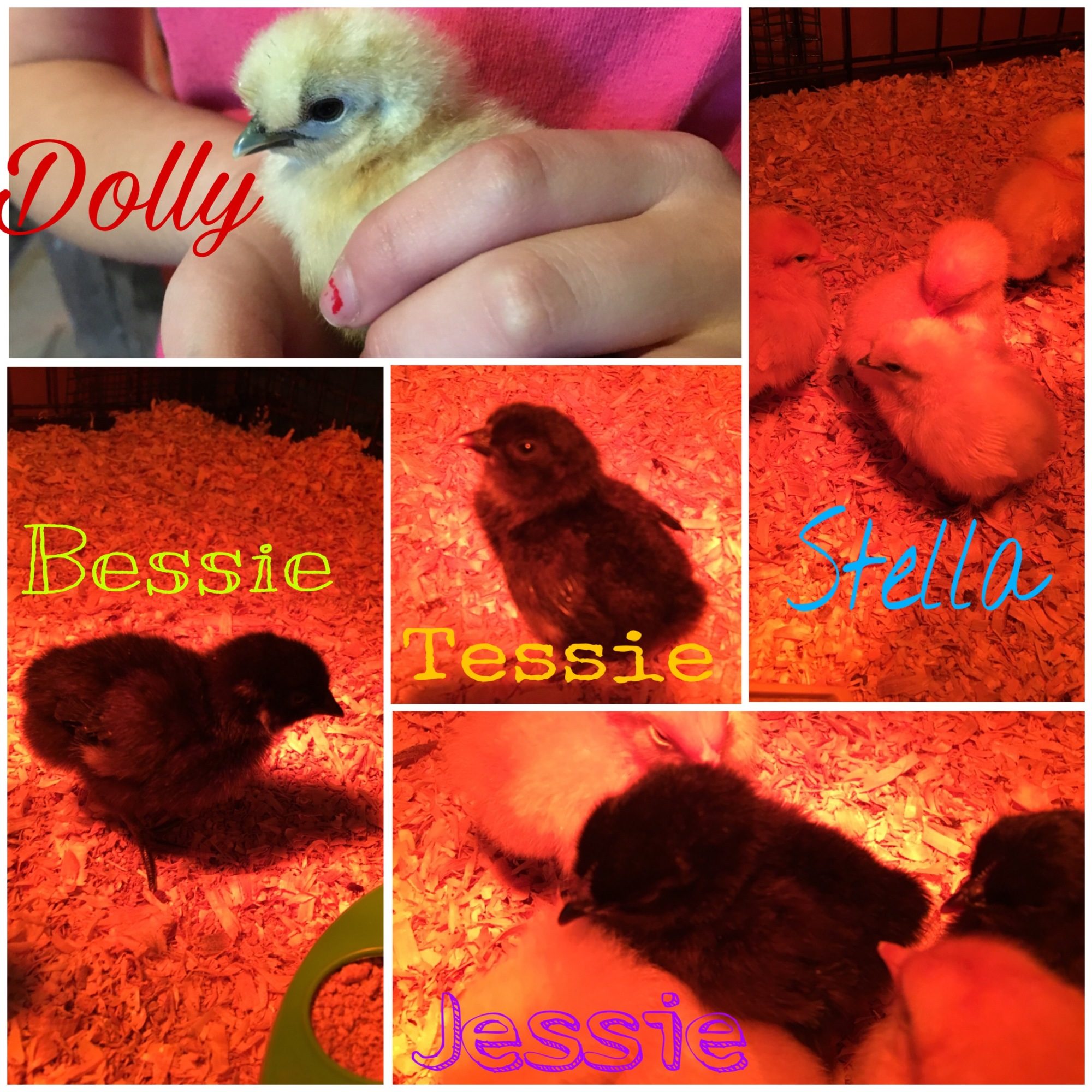 We got them all from TSC last Friday so they are now about 5 days old, but they were only a day old in these pictures. The two yellow ones in the first picture were labeled "straight run bantams" and based on what I can find I believe they are white silkies, yay! The others are from a tub of "straight run" Black Sex Links, and if I chose right they are all females. We also have 5 Orpingtons that I believe are all buff, also straight run. (We named them all girl names in hopes that we won the straight run lottery and got all females, but we are aware that is most likely not the case... the Orps are Queen Elizabeth (shes currently the boss), Rue (the tiniest), Emily, Georgia, and Beatrix (the lover). I am going to try to get pictures of them tonight