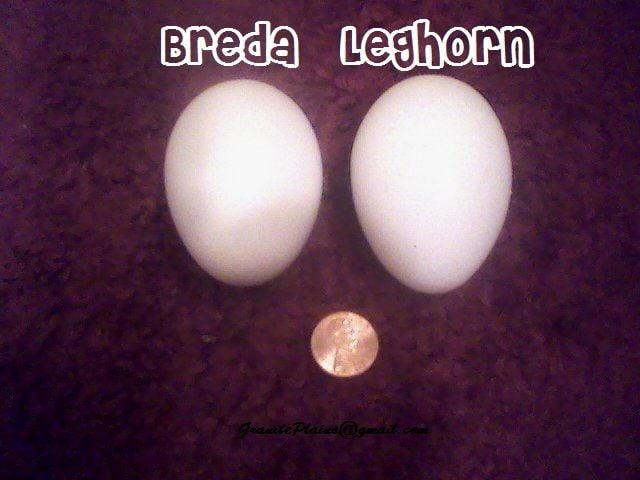 Note: Commercial White Leghorns have the "white egg" gene that will block all brown egg pigments (even if the hen is carrying the genes for brown pigment). This tends to give the egg of Leghorns an almost florescent white. The Breda does not have the "white egg" gene and if they are carrying any genes for a brown bloom it will show on the shell. Some days the difference in color is enough that I can see a noticeably different color between the Breda eggs and the Leghorn eggs, but as shown most days (9 out of 10) the Breda egg is just as white as a Leghorn.
