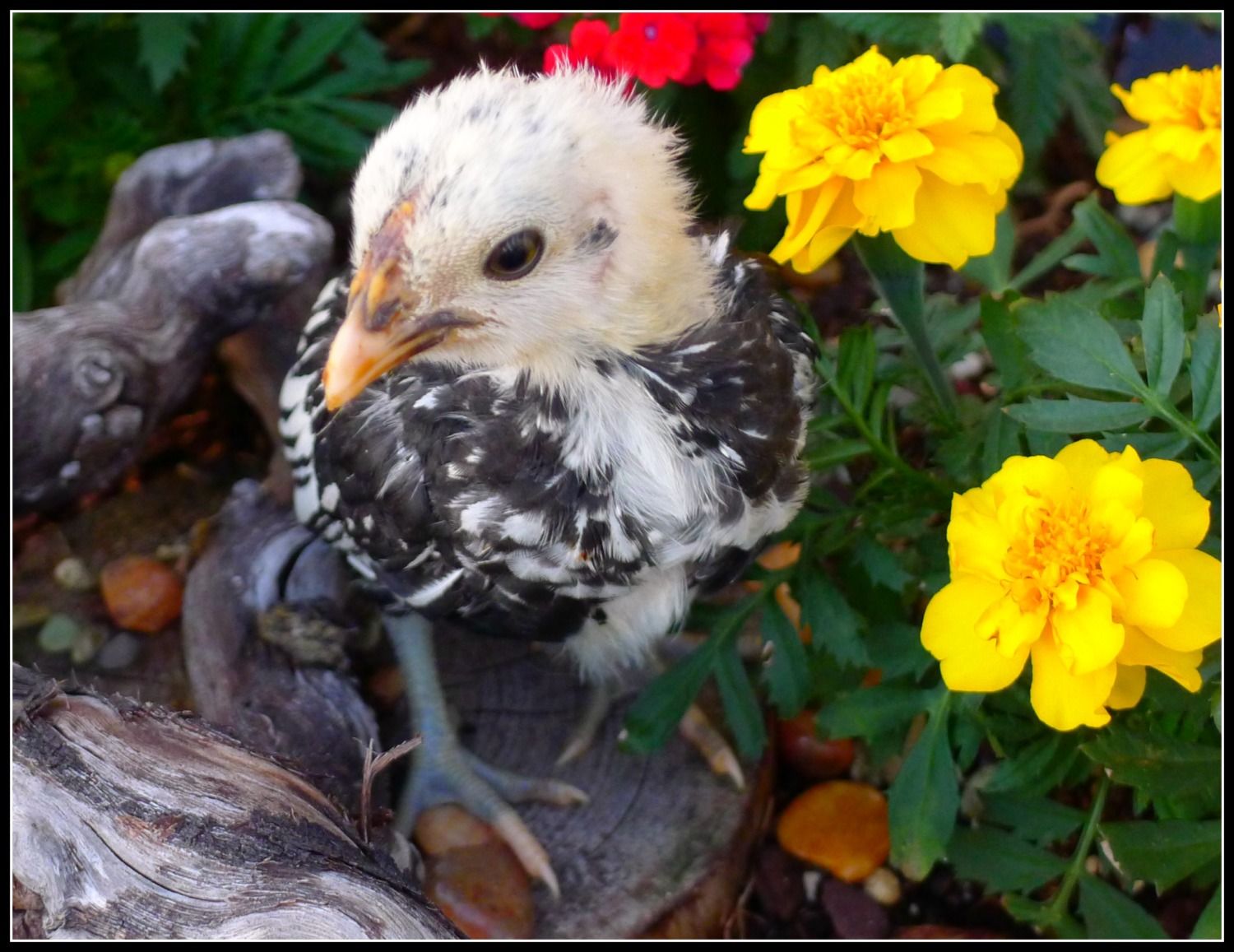 This is my pride and joy Fraggle! S/he's a bit of a spaz but I love him (or her). I was thinking a black frizzled cochin? Maybe a pullet since the comb is not red yet or is it still too early for that? Probably a roo since it's my fave!