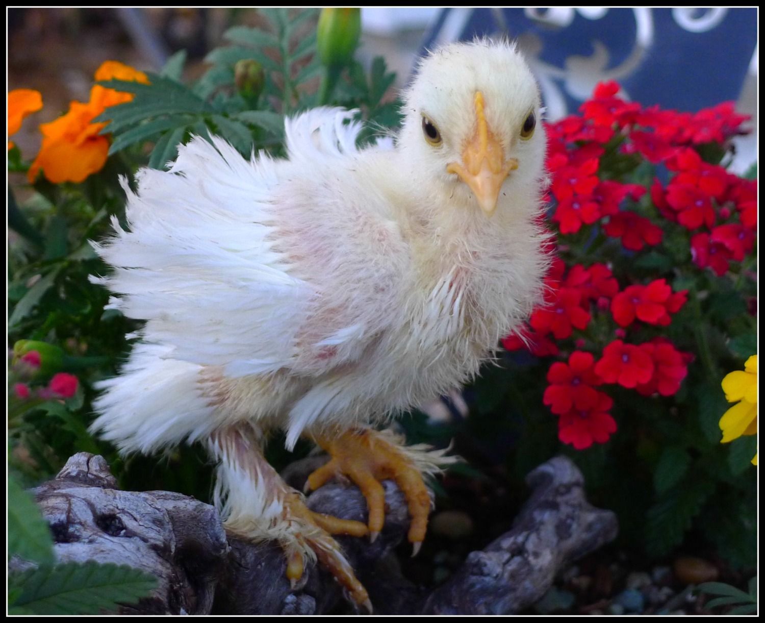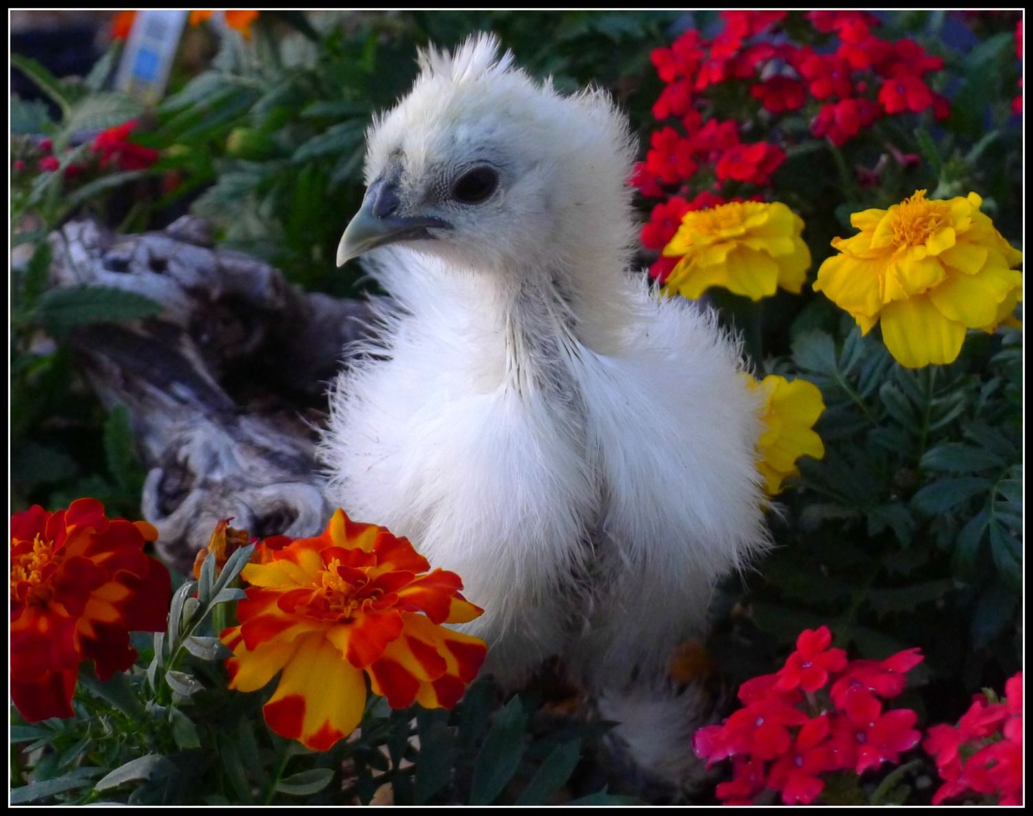 This is Fancy, my second fave. She has the black beak, skin and funky looking feet with five toes! I'm guessing s/he's a silkie? Have no idea on gender. Any thoughts?