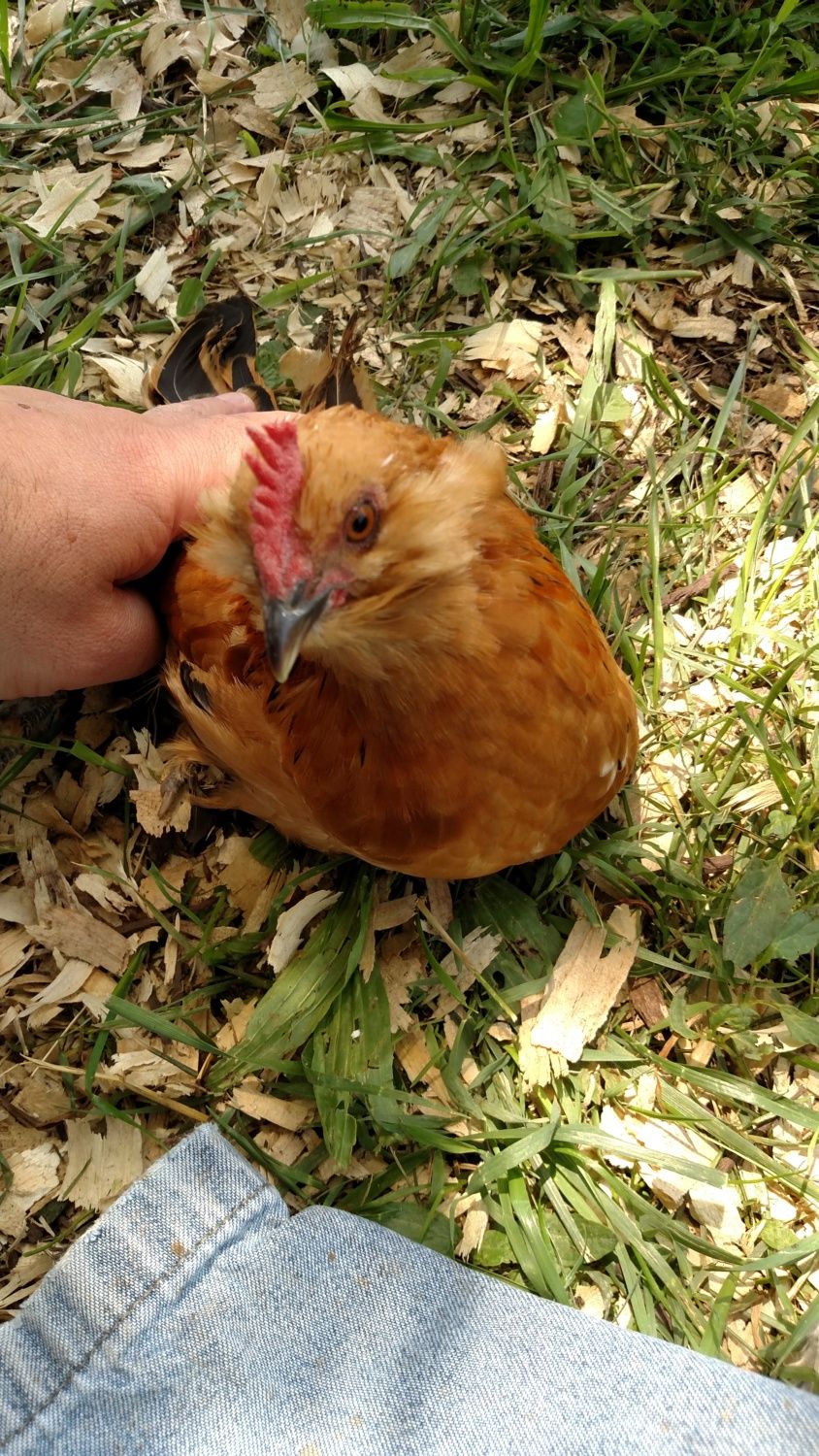 A pair of mille fleur d'uccles and a buff brahma cockerel.