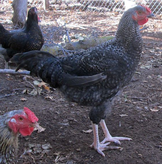 This is Dooley, He comes from a very large Cuckoo Marans roo and a Wyandotte hen (I think). My assumption about the Wyandotte hen is because of his comb, but I'm not 100% certain because we have other brown egg layers too and he was hatched out of a brown egg. Our other brown egg layers are Delawares and Dark Cornish, his comb looks like Wyandotte to me though.