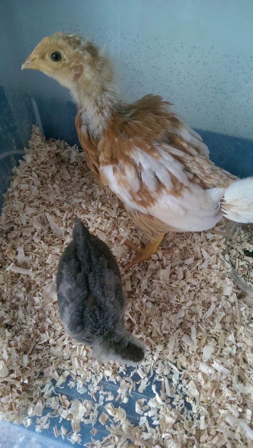 Some joker gave my wheelchair bound grandfather chickens for Easter so I went to pick them up (he isn't capable of caring for them) I don't know anything about them. Breed, age, gender (obviously) any advice would be helpful. I realize there is no way to tell on the smaller one but anything screaming roo with the bigger one, I have my suspicions that it may be.