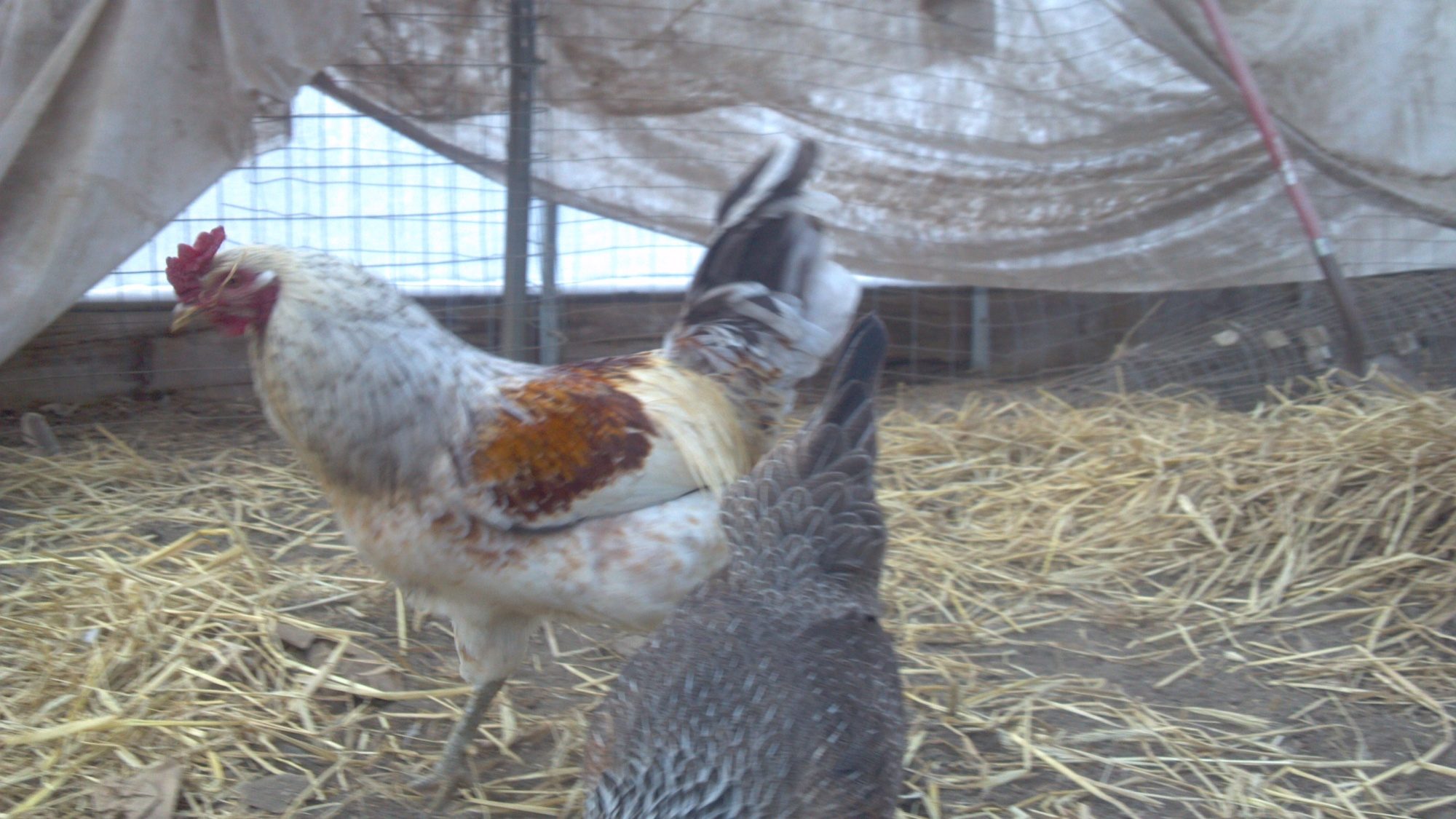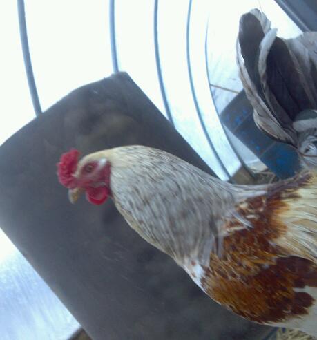 He's a beardless Easter Egger. Pea comb, green legs, and common male coloration for an EE. I'm pretty positive, especially if you were told he's an Ameraucana. Lots of folks mistake EEs for Ameraucanas, but they're not exactly the same. There are a lot of similarities, but they are EEs if they don't fit the breed standard.