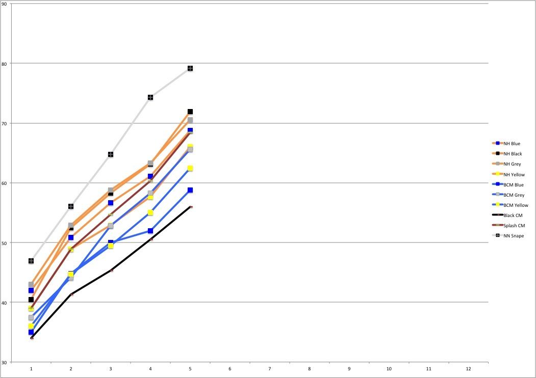 This graph has weights in oz from 9 through 13 weeks. The orange lines are GNHs, the red is the splash CM, the blues are Blue CM, and black is Black CM. (The light grey at the top is my main NN flock rooster Severus Snape at the same ages, though he grew up in the fall).