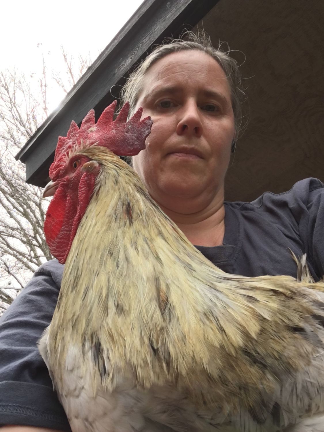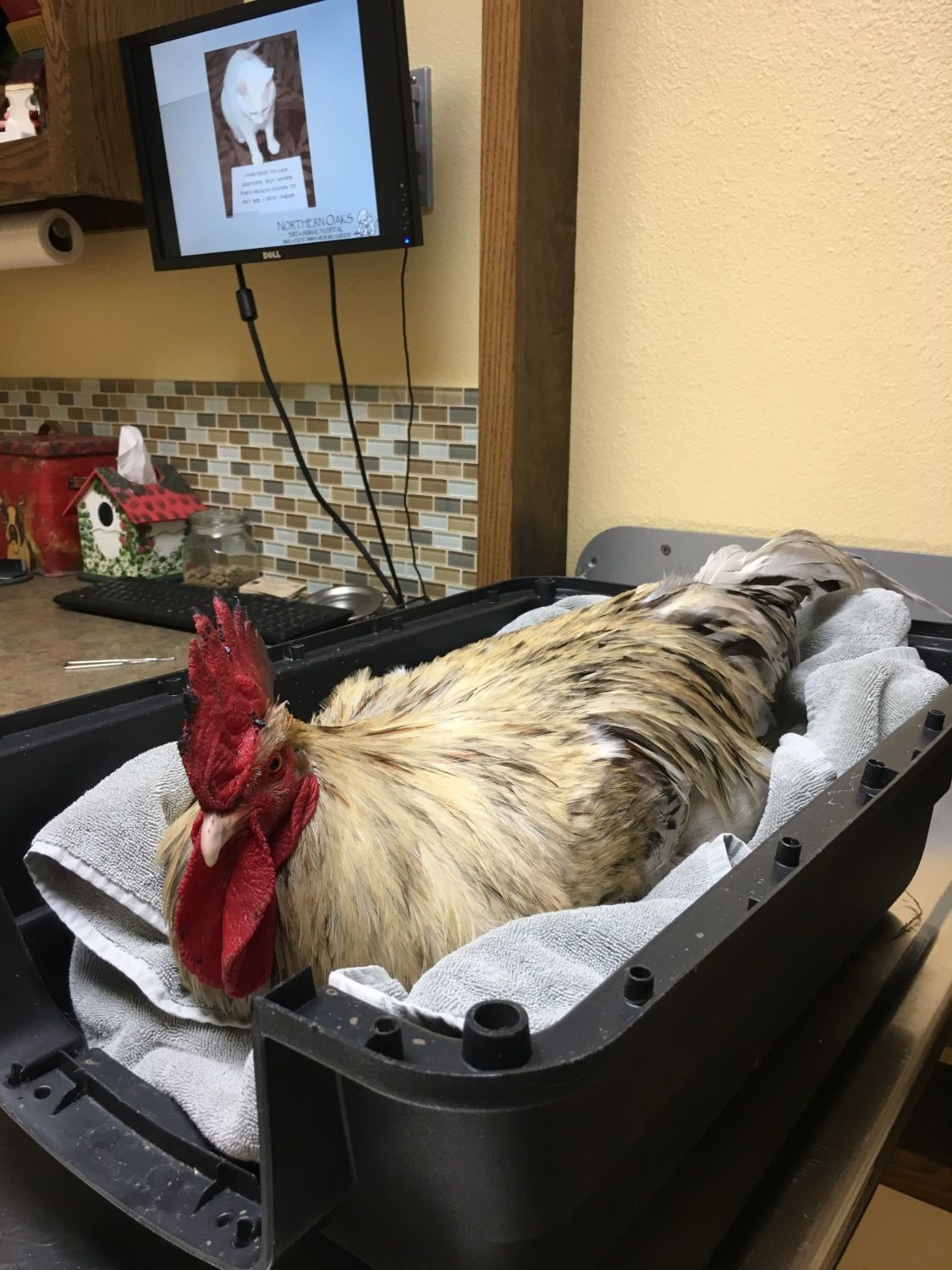 He was VERY well behaved, very sweet, super super mellow guy. Everyone at the vet adored him - they love chickens. He crowed for them a few times when he got bored waiting.