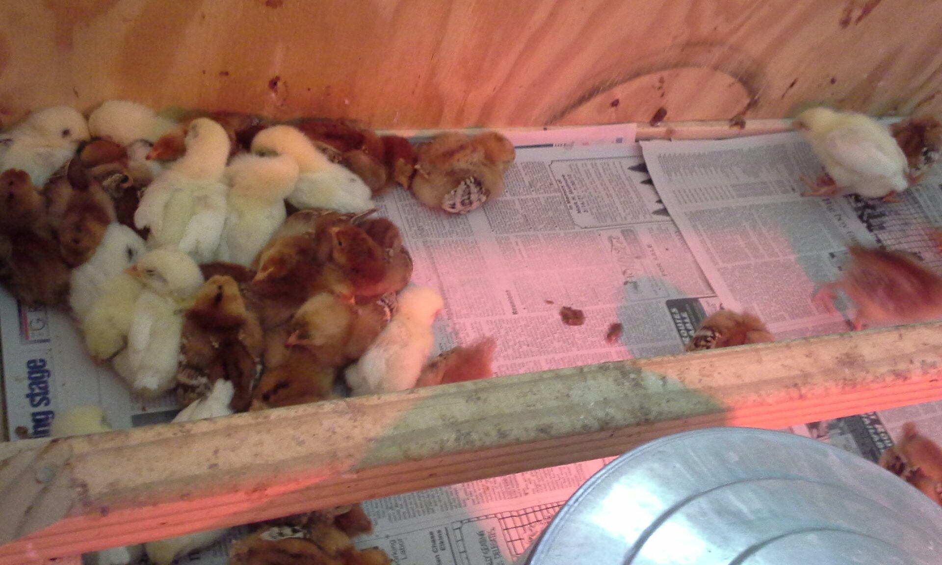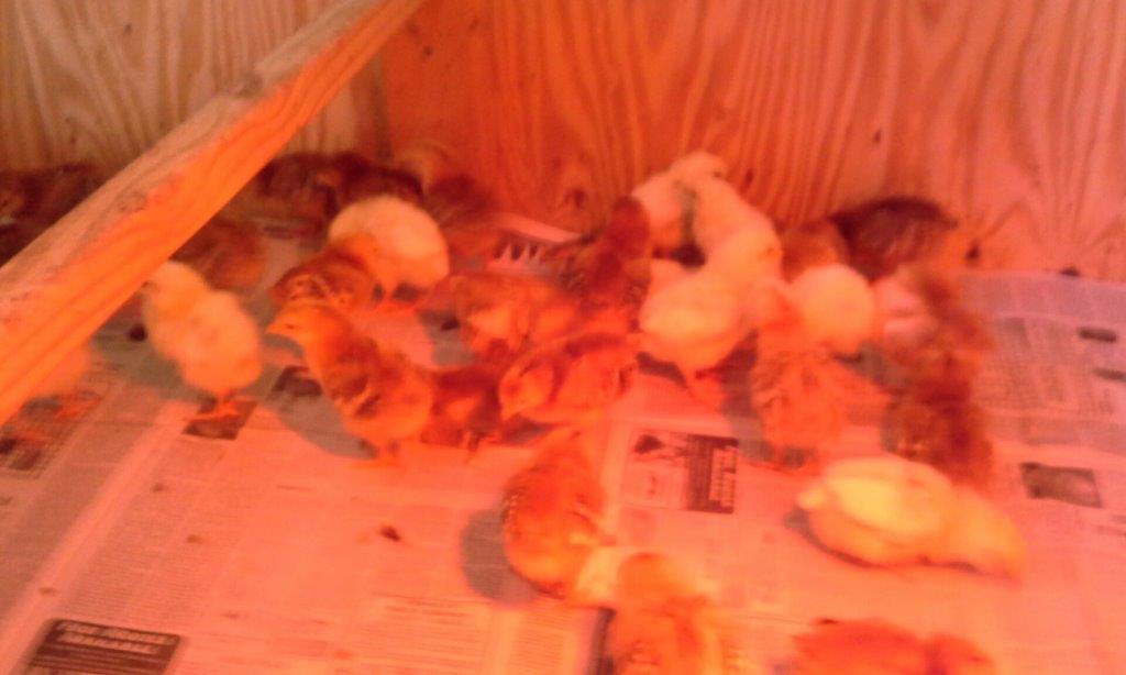 Linda, there are three breeds here, all hatchery stock. Austra-Whites (fairly obvious), Buckeyes, with light colored heads and just a few RIRs , with darker heads. Sorry for the pic. I'll get much better ones Saturday or Sunday. They are in shavings now and according to Brother, they are more than double in size. That brooder won't hold them healthfully very much longer but we have a 12X16 room all set for them in the barn. Still not sure if the RIRs are coming. No matter either way.
