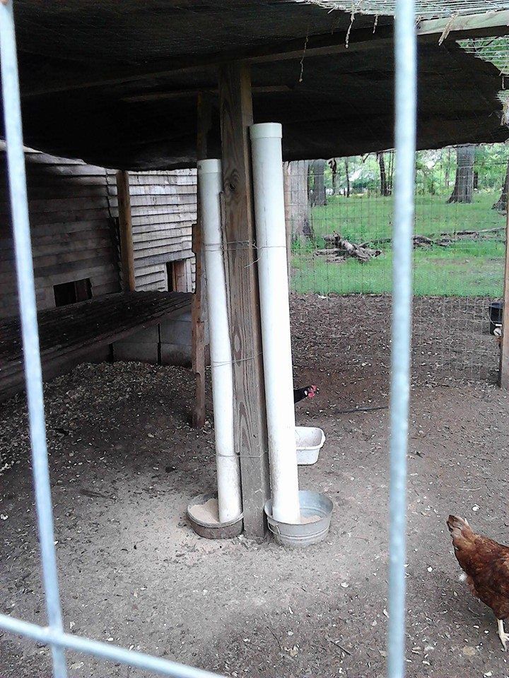 Here are my feeders they each hold abt. 25 lbs of feed one dish is deeper than the other. And I took a close up of the cut we made in the bottom of the PVC so you can see it.
