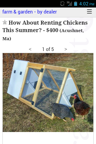 Could you imagine paying $400 for a couple chickens and a little tractor, pay for they feed also for a few months. Don't remember what the payoff was on the rent to own...Lol.