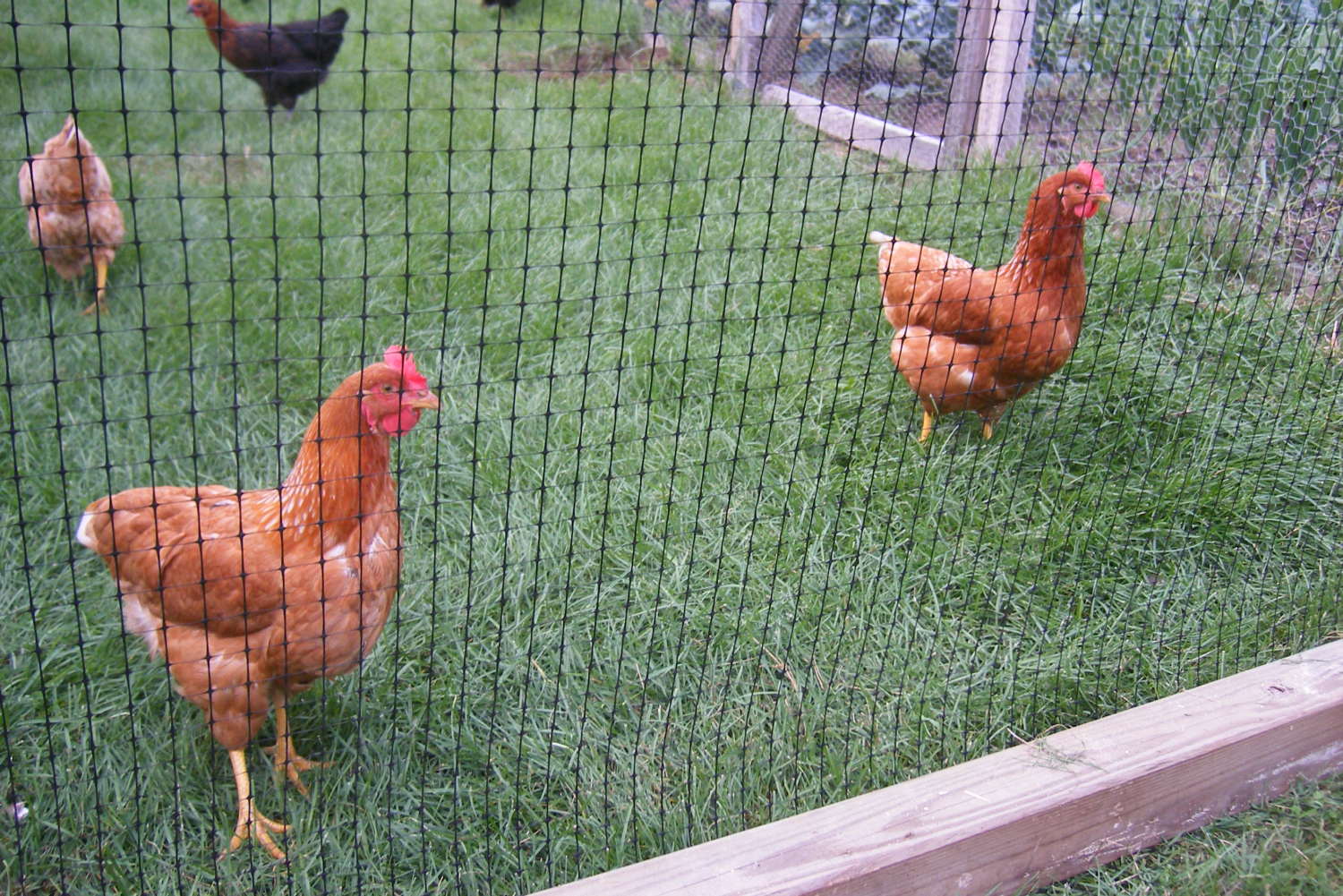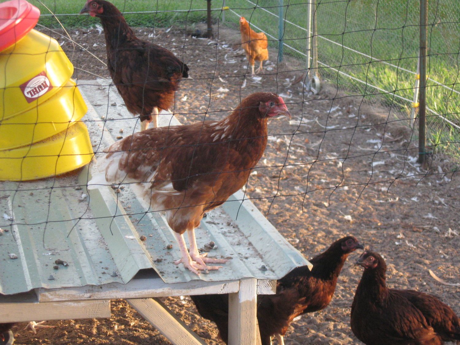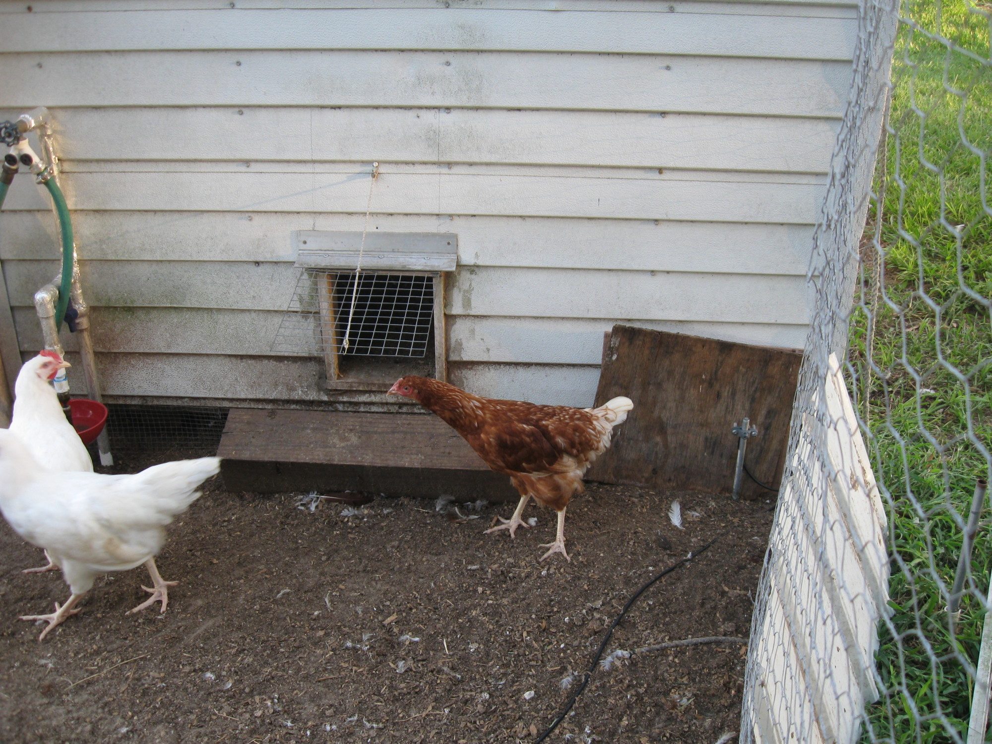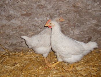 We're so involved with our Rock lines and our HRIR lines that we just didn't do a whole lot with this old project. It won't be going forward. I did put a Red over the best of the white birds and got males that looked like an ISA Brown female. The female, the lone female, is white with a bit of red streak the front of her neck. She's not a confident bird like her mother was. I don't know why. Luck of the draw. I was hoping for a replacement for the old girl, but it was not to be. Here she is standing behind her twin brother, the lone white cockerel. He went bye bye as I had no use for him.
