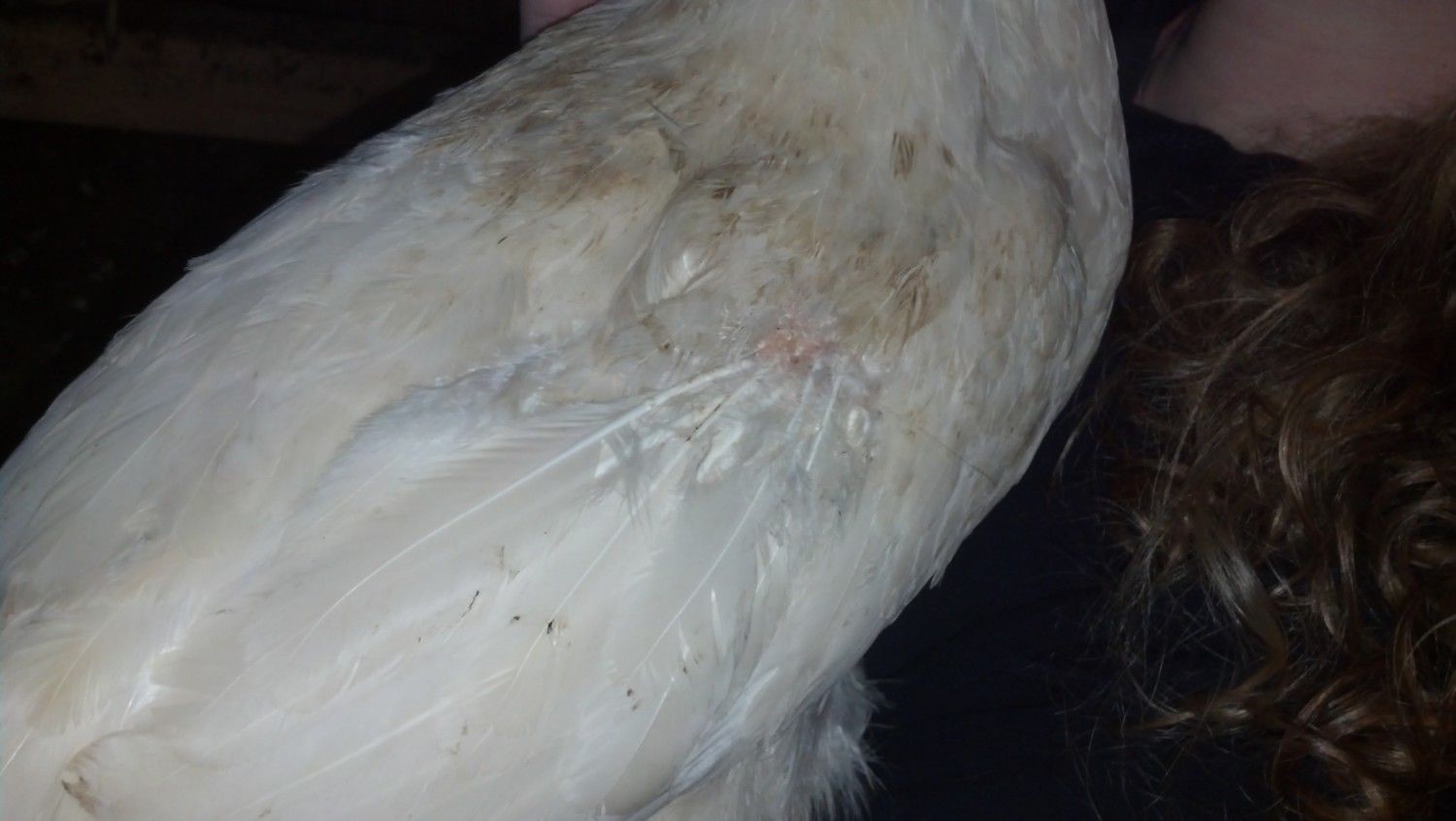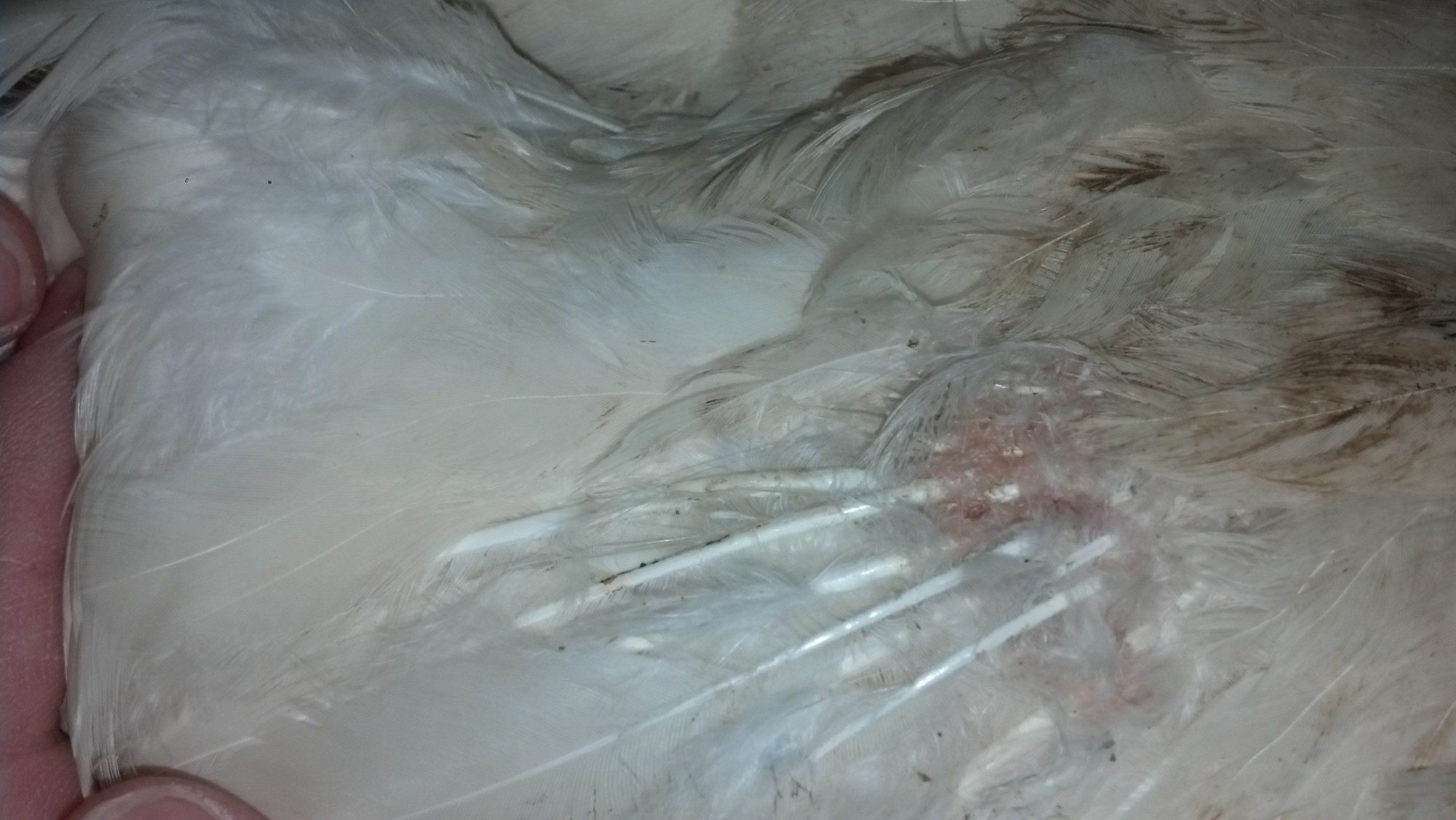 Hello and Good morning. I was wondering if any one would have some advice for me. I have a hen, Scarlet, who has a small cluster where her feathers have been broken off near the base. Her skin is a nice normal color but it does seem a little swollen, Im not sure if a should A) remove the feathers that have been broken off, put some kind of ointment on it and cover it. B) leave them in, put something on it and cover it. C) remove her from the flock and put something on it. D) do nothing. E) something other then what I have come up with. I thank you in advance for any and all help, I truly love my girls and would like to have her fixed up as soon as possible!