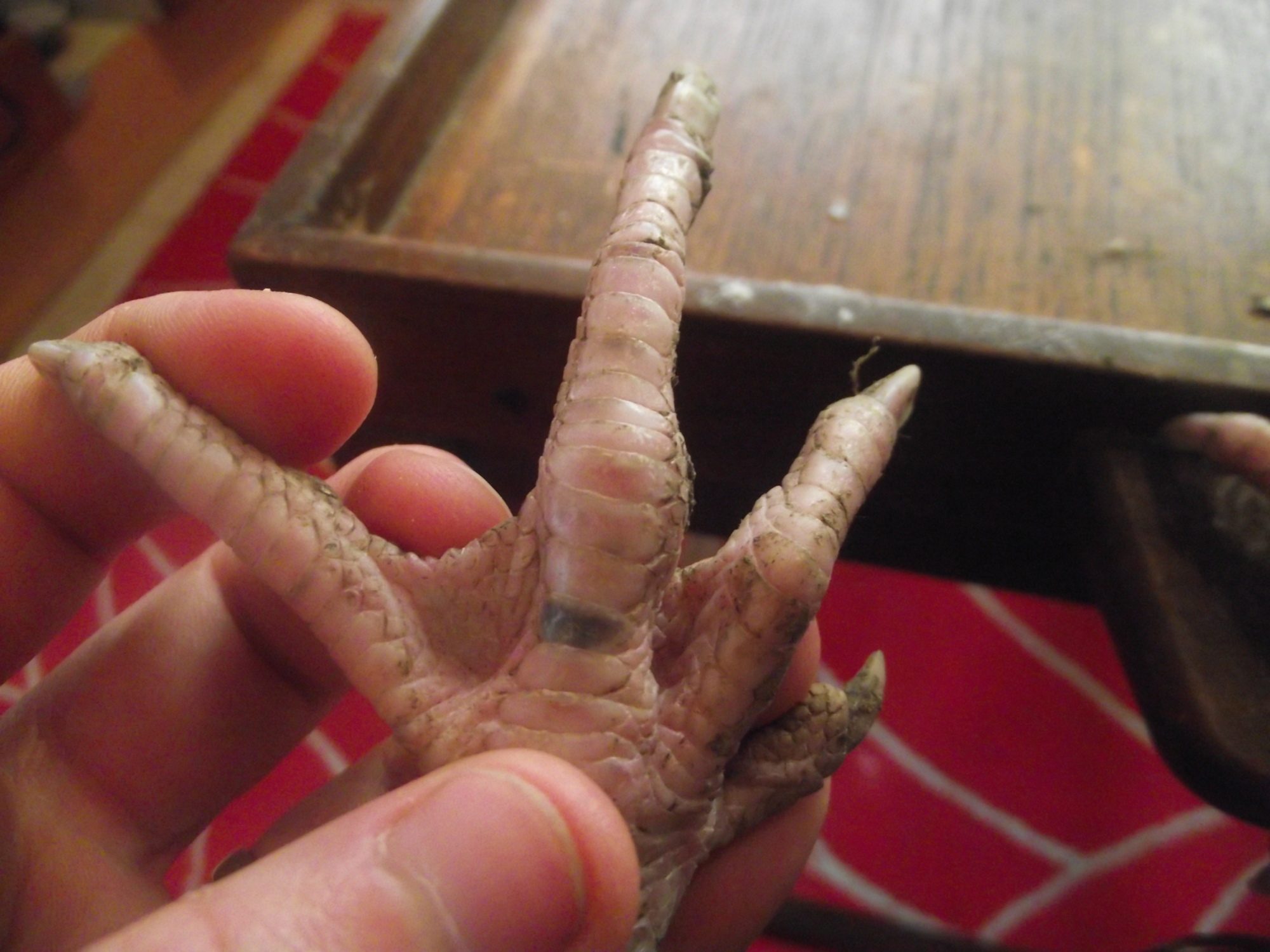 My 18-months hen Renfield is having trouble with one foot. She walks ok, but if she tries to run she starts limping and stumbling. One of the joints in her toe looks bruised and swollen compared to the match on the opposite foot - is it a break? She's in moult at the moment, I don't know if that has any bearing.