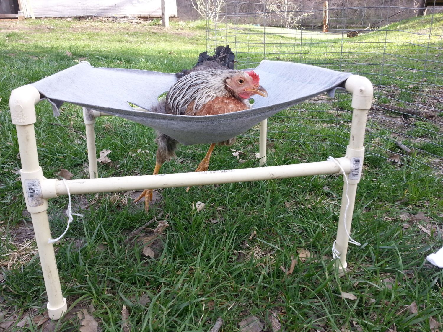 Still alive. Saturday I had her in her sling, but she managed (twice) to somehow flip out of it and onto her back. So I made her a 'hammock' as our boys have started calling it, out of the PVC that held up the bird netting in my garden. It has worked well. I rigged a way to attach her food and water on it and she's sort of independent now. She spends most of the day outside in her hammock. I keep her in a little wire fenced in area, just in case something wanders into our yard.